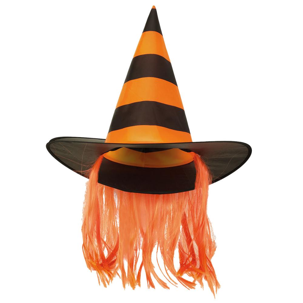Skill deg ut på neste maskerade med denne oransjestripete heksehatten med hår. Det er en perfekt hatt til halloweenmaskerade for barn som vil trylle fram stil og kle seg ut som en skummel heks.