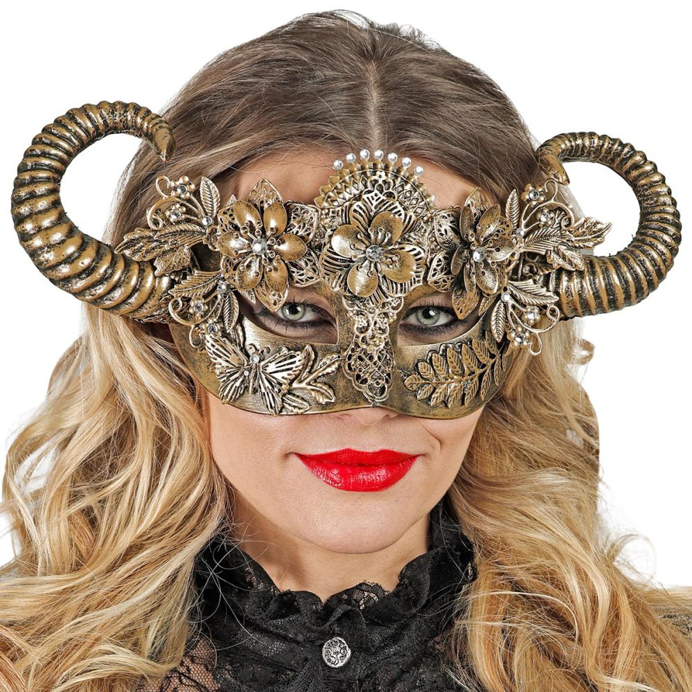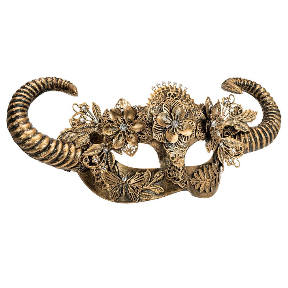 Øyemaske med Vædderhorn er en maske i svart og gull, dekorert med plastjuveler, en sommerfugl, blomster og andre planter. Masken har to værhorn og holdes på plass med et elastisk svart bånd.