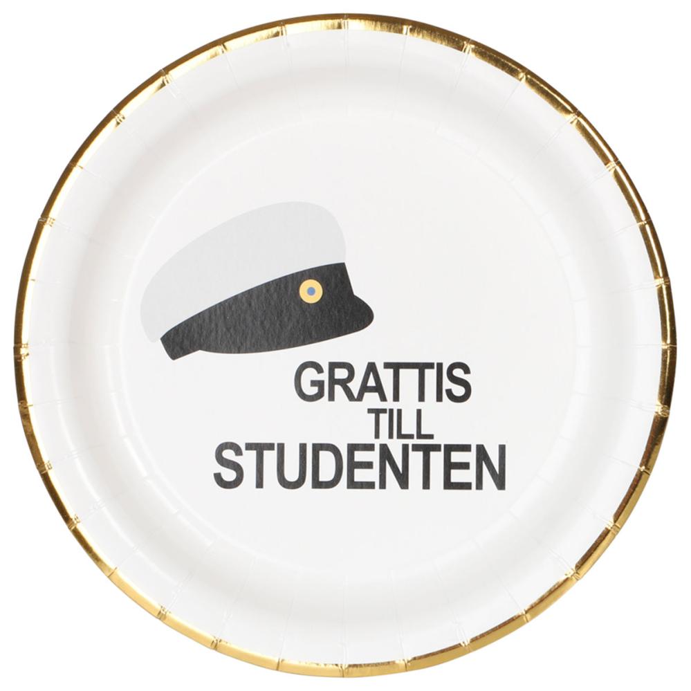 Pappasjetter Studentlue 18 cm 8-pakning inneholder åtte hvite pappasjetter med gullkant og er dekorert med teksten ”GRATULERER TIL STUDENTEN” i svart samt en klassisk studentlue.