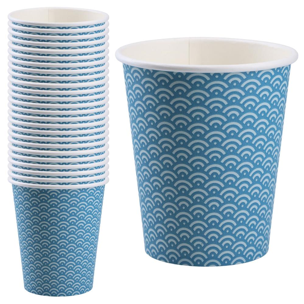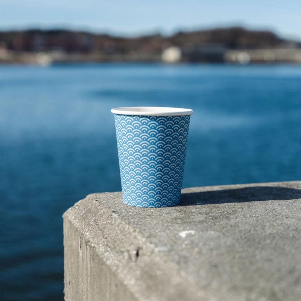 Pappkopper Bølger 23 cl 25-pakning inneholder 25 engangskopper, dekorert med et blått bølgemønster.