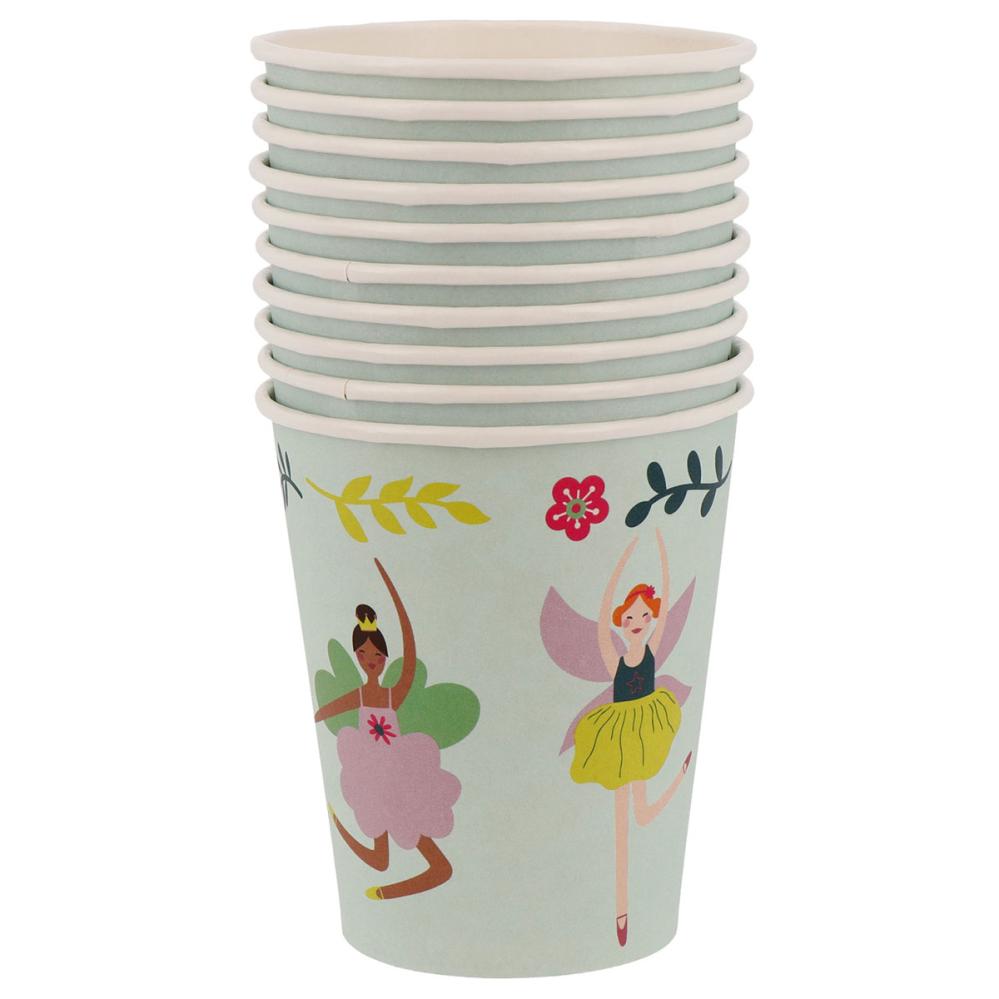 Pappkopper Fabulous Fairy 10-pakning inneholder ti salviegrønne engangskopper dekorert med fargerike blomster og dansende alver i ballerinaklær.