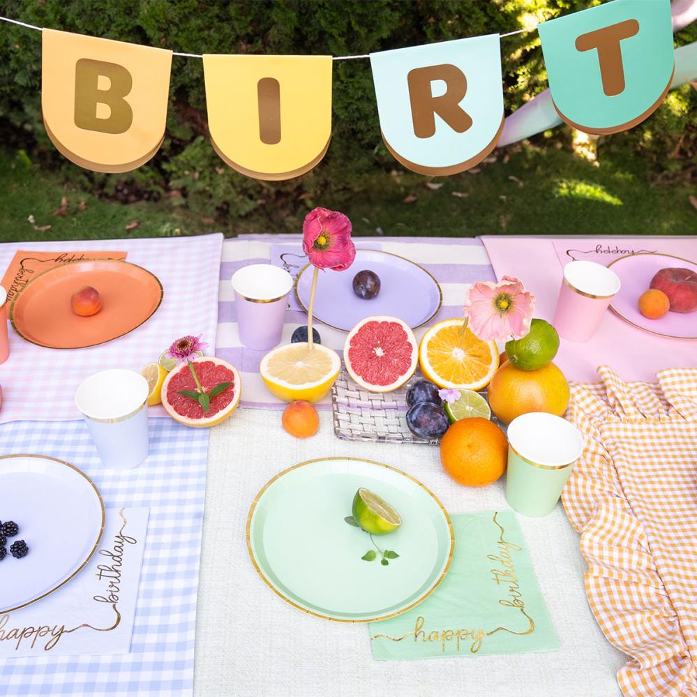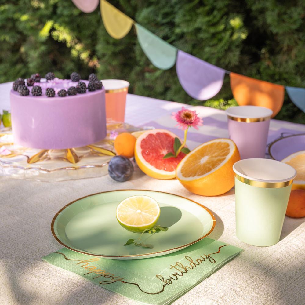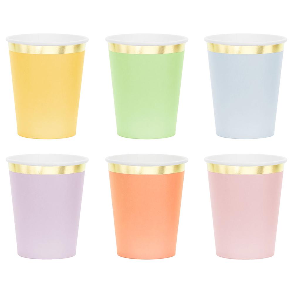 Pappkopper Fargemix med Gullkant 6-pakning inneholder seks engangskopper i pastellfargene grønn, blå, oransje, rosa, gul og lilla med gullfargede kanter.