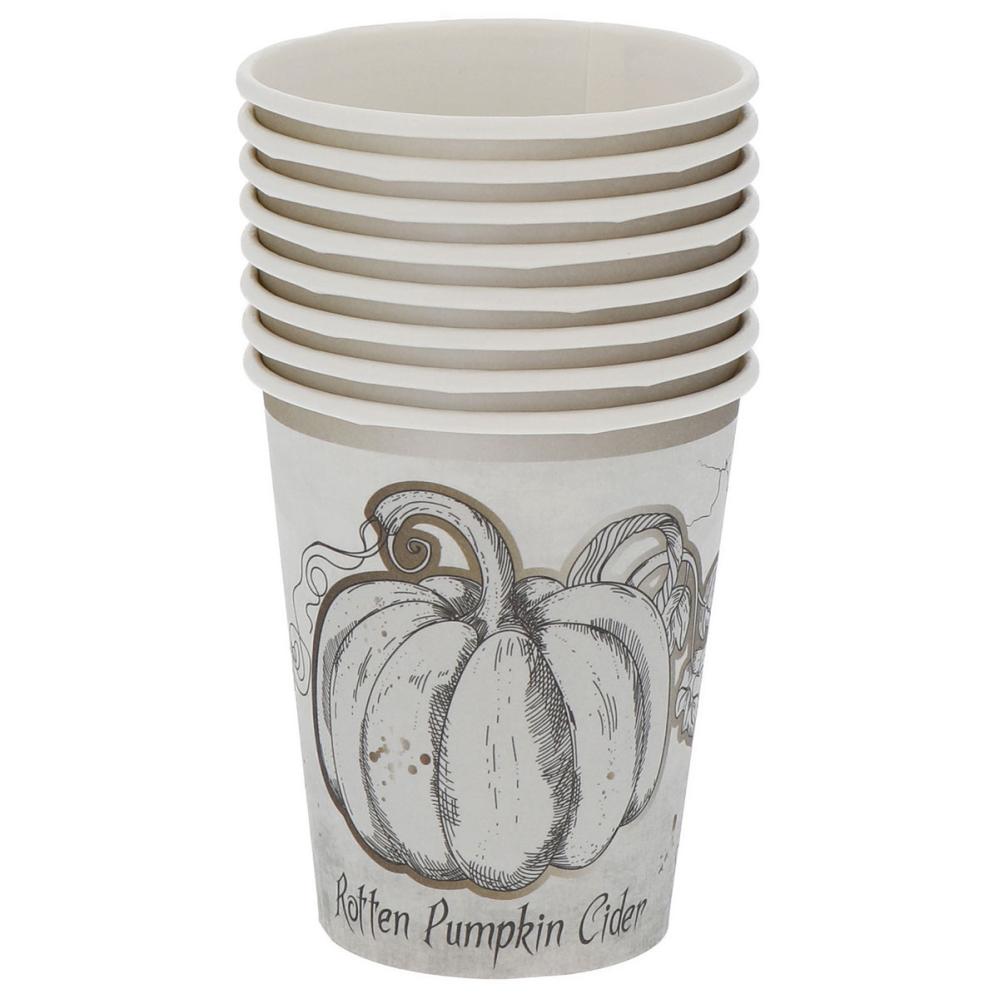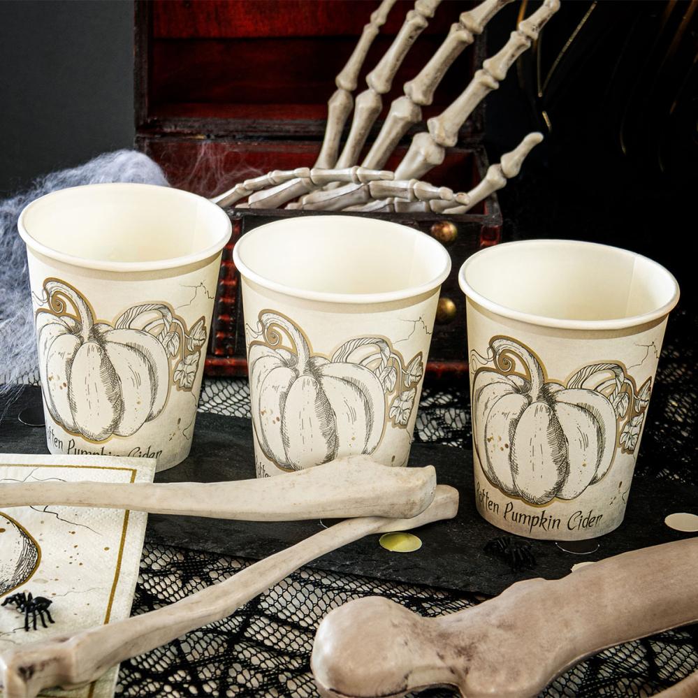 Pappkopper Halloween Gresskar 8-pakning omfatter 8 hvite pappkopper med en vakkert detaljert tegning av et gresskar med gulldetaljer. Helt nederst på koppen står også teksten ”Rotten Pumpkin Cider”.