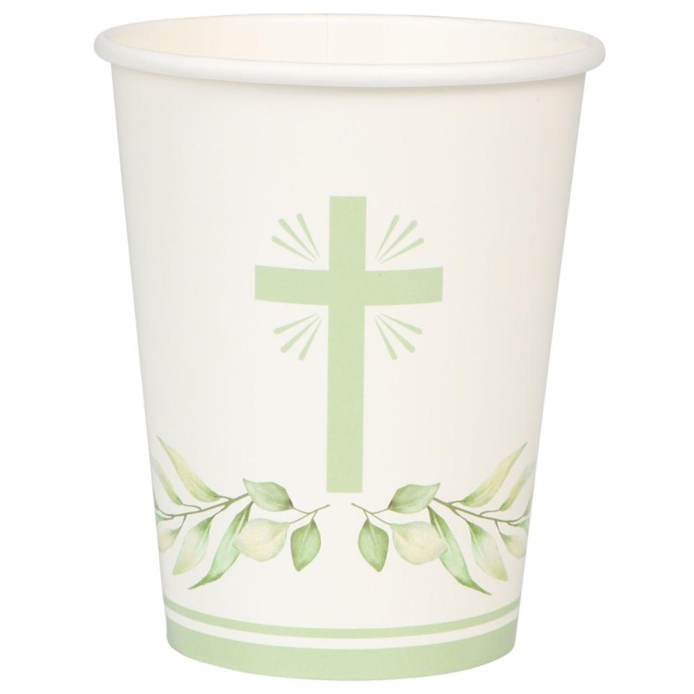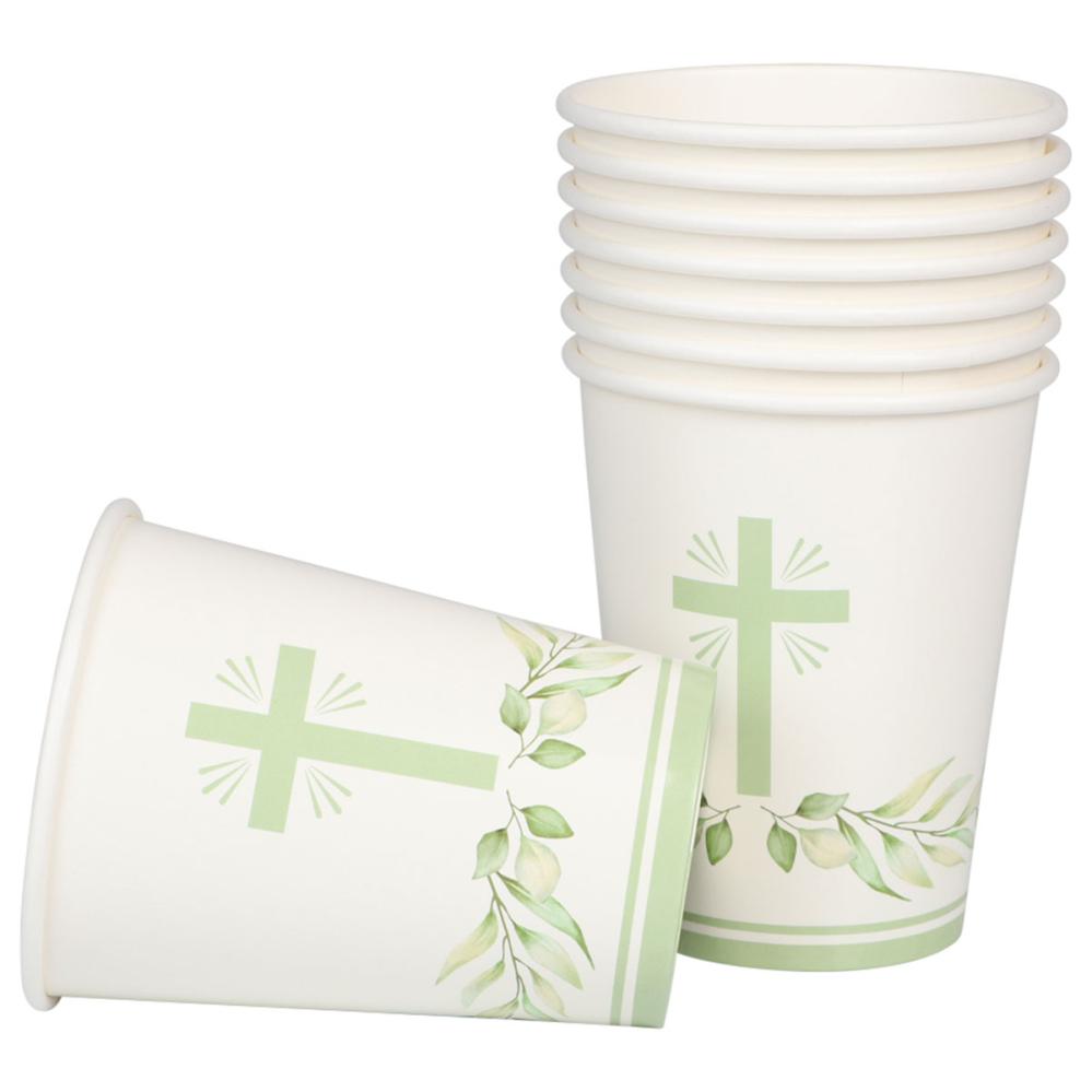 Pappkopper med Kors og Bladkrans 8-pakning består av åtte hvite pappkopper med et lysegrønt motiv av et kors samt en bladkrans rundt koppens nedre kant.