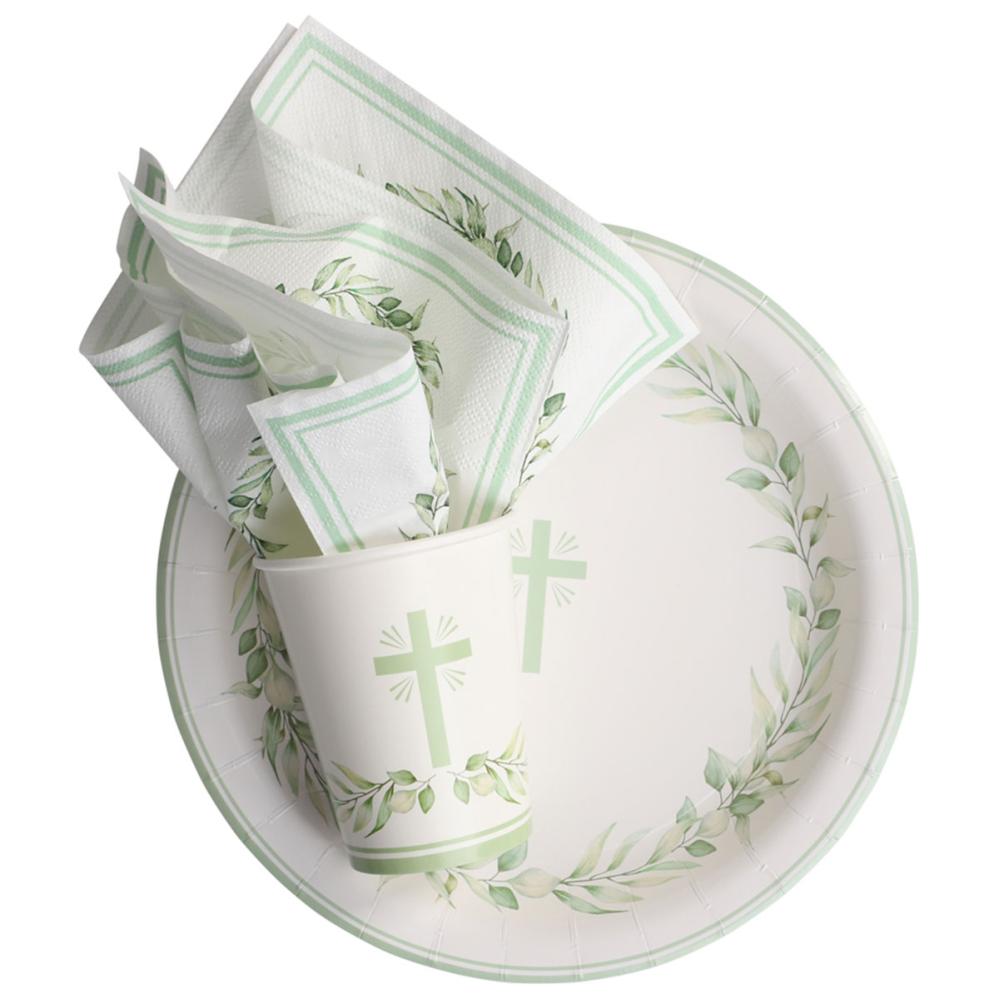 Gjør borddekkingen enkel med dette dåpstilbehøret i form av hvite pappkopper med lysegrønt kors og bladkrans. De er perfekte som pappkopper til dåp og passer også som pappkopper til bryllup. Det er også et stilrent tilbehør til feiringen av konfirmasjonen.