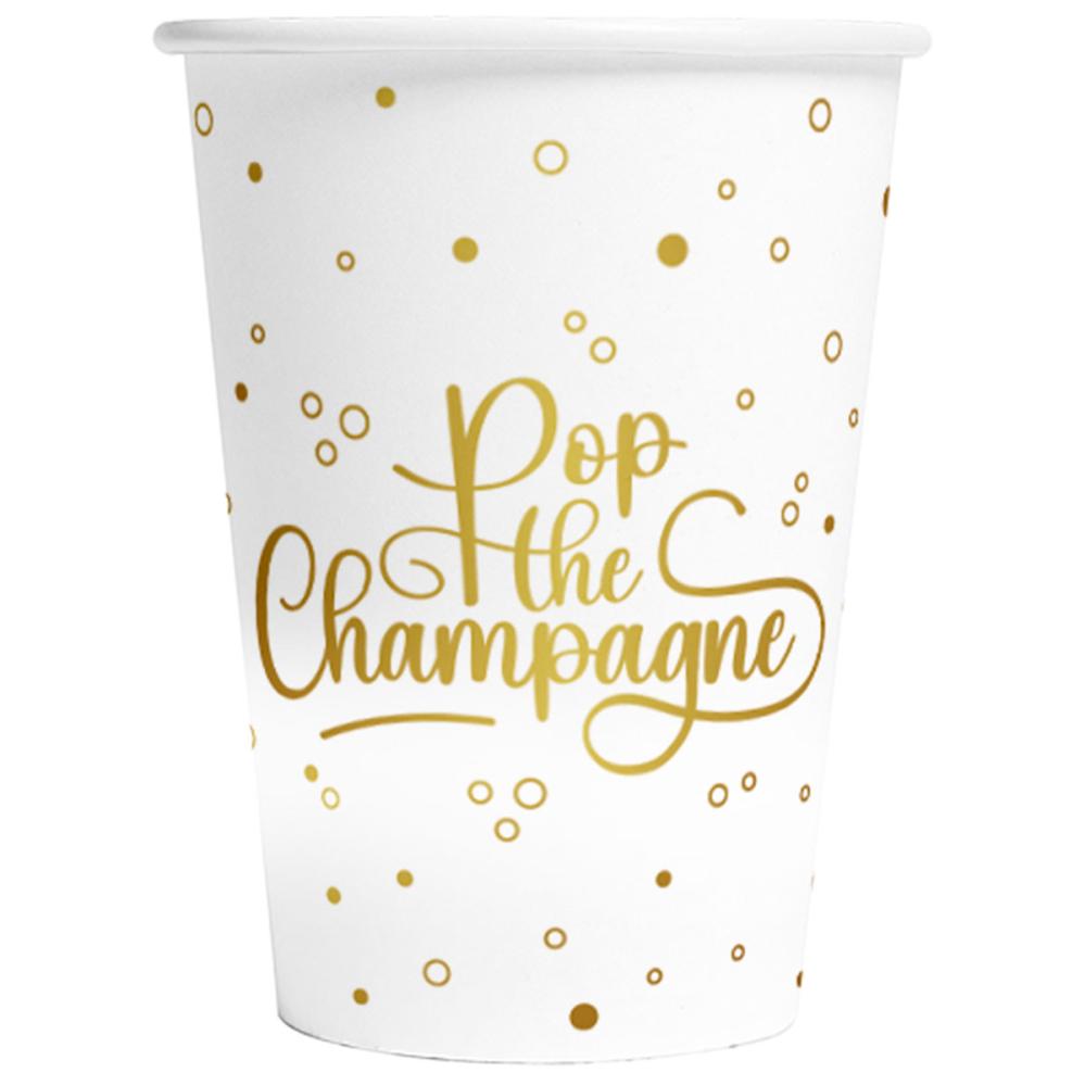 Pappkopper Pop the Champagne 8-pakning består av åtte hvite pappkopper som har motiv av champagnebobler og teksten ”Pop the Champagne” i en dempet gulltone.