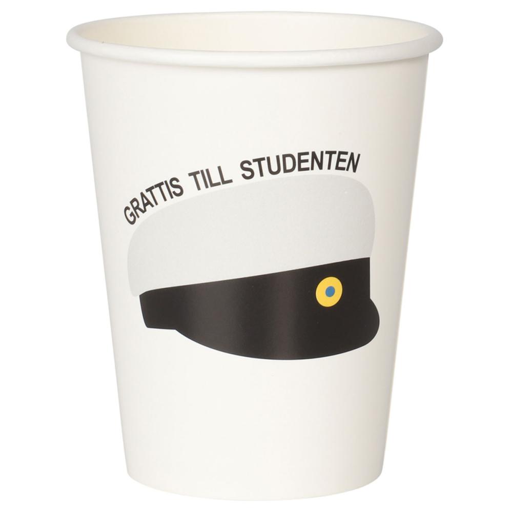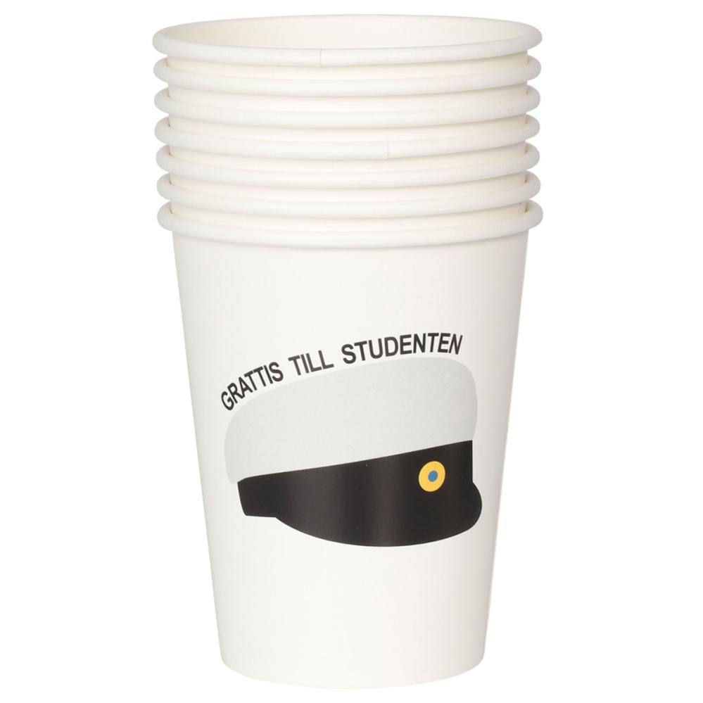 Pappkopper Studentlue 25 cl 8-pakning inneholder åtte hvite pappkopper, dekorert med teksten ”GRATULERER TIL STUDENTEN” i svart samt en klassisk studentlue.