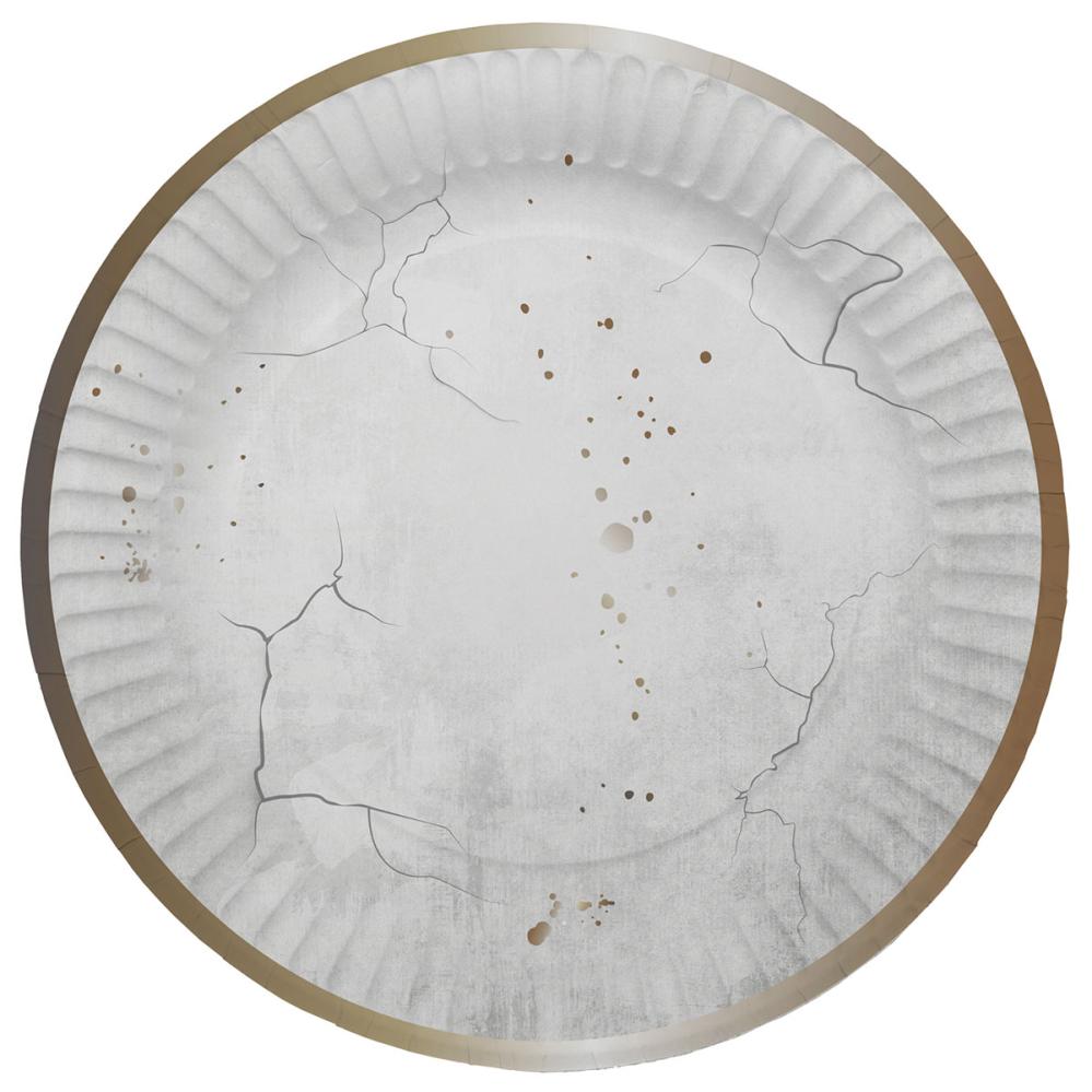 Papptallerkener Creepy Cracks 8-pakning omfatter 8 stk papptallerkener med en sprukket, grå steindesign med en skinnende gullkant og detaljer.