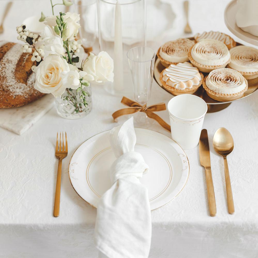 Med gulldetaljer blir disse hvite engangstallerkenene en liten fest i seg selv, som om bordet akkurat har øvd på å gjøre entré. Disse tallerkenene passer til bryllup, jubileum, nyttårsfest eller Gull & Glamour temafest og gjør borddekkingen litt ekstra stilfull.