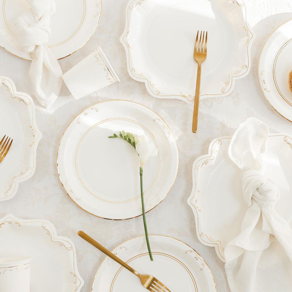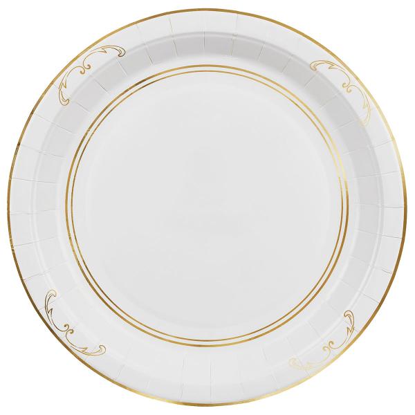 - Hvite engangstallerkener med gullornament