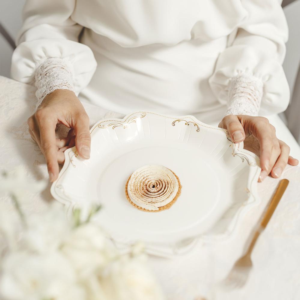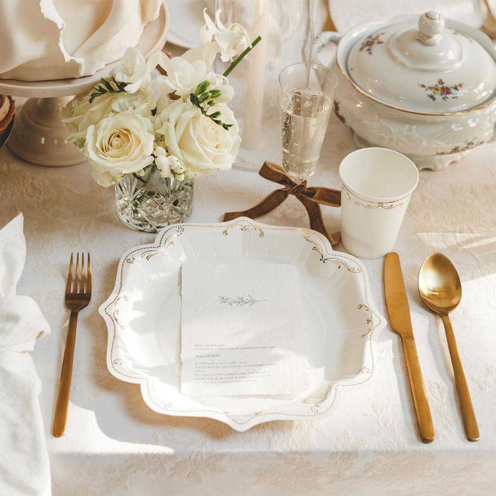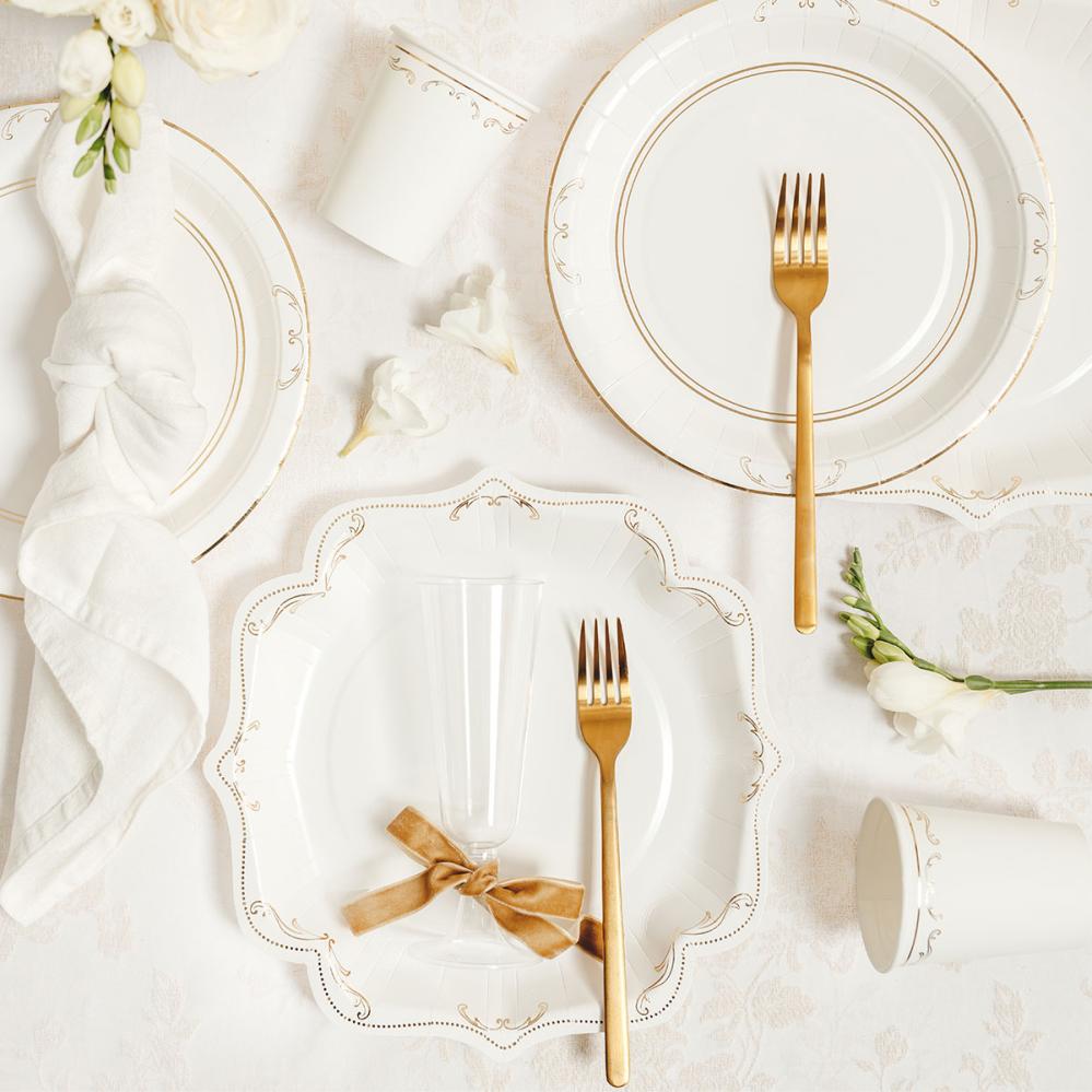 De passer perfekt som tallerkener til bryllup, jubileum, nyttårsfest eller Gull & Glamour temafest når du vil at borddekkingen skal skille seg ut. Disse hvite engangstallerkenene med gulldetaljer holder kaken med selskap uten å helt stjele kveldens applaus.