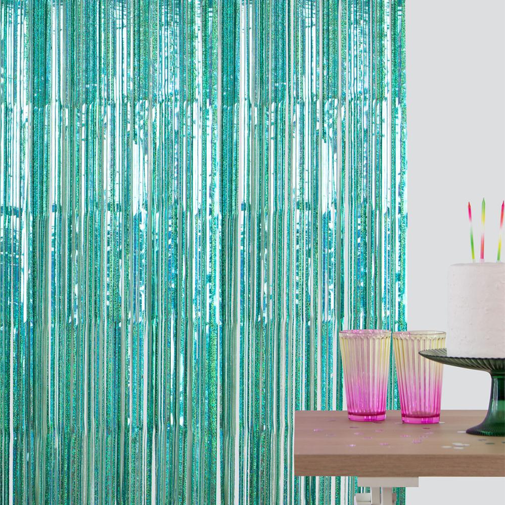 Party Draperi Iriserende Turkis 200x100 cm består av et festlig dørforheng med lange og tynne remser i en turkis farge med små, skimrende prikker som skaper en holografisk effekt.