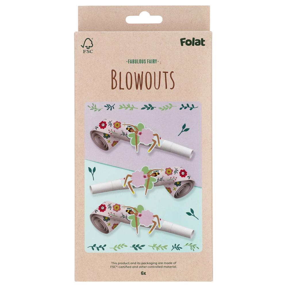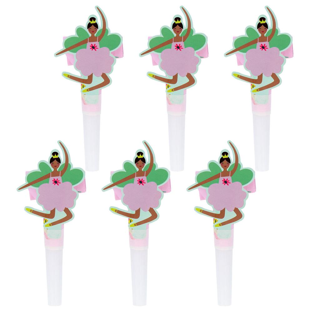 Partyfløyter Fabulous Fairy 6-pakning omfatter seks rosa partyfløyter som er dekorert med motiver av fargerike blomster og utstyrt med en pappfigur som sitter fast på fløyten i form av en dansende fe i ballerinaklær. Blås i fløytene for at de skal tute høyt og rulle seg ut.