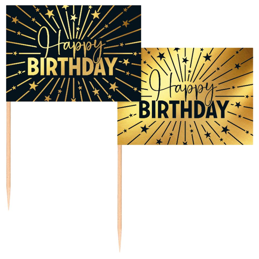 Partypicks Happy Birthday Gull/Svart 50-pakning