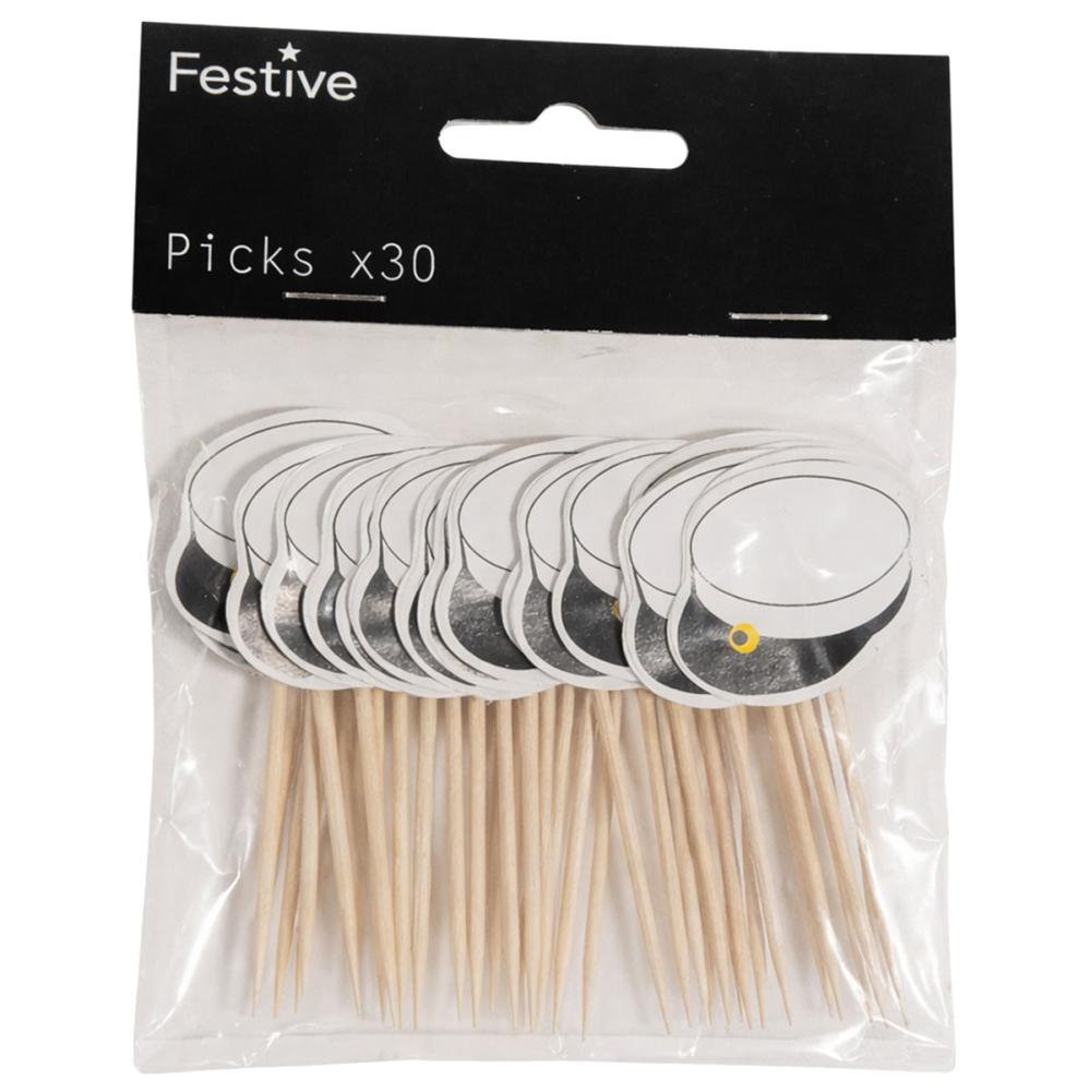 Partypicks Studentlue 30-pakning består av tretti trepinner med papirdekorasjoner som forestiller studentluer i svart og hvitt. Dekorasjonene har dobbeltsidig trykk som gir et flott utseende fra alle vinkler.