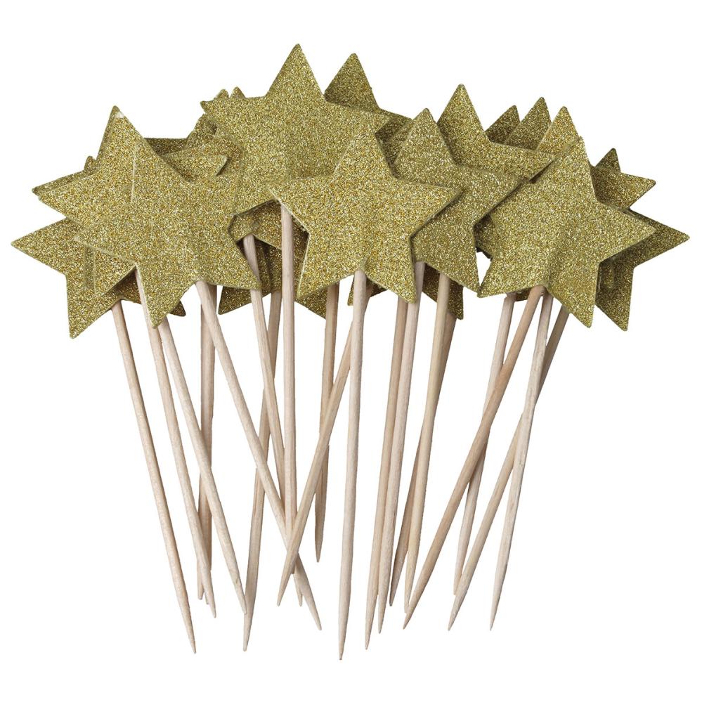 Partypinner Gullstjerner med Glitter 20-pakning inneholder tjue partypinner med gullfargede stjerner med glitter.