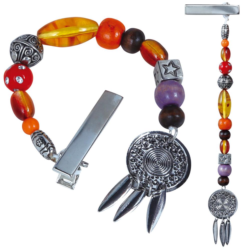 Pirat Hårklemme omfatter en hårklemme med røde, oransje, svarte, lilla og sølvfargede perler.