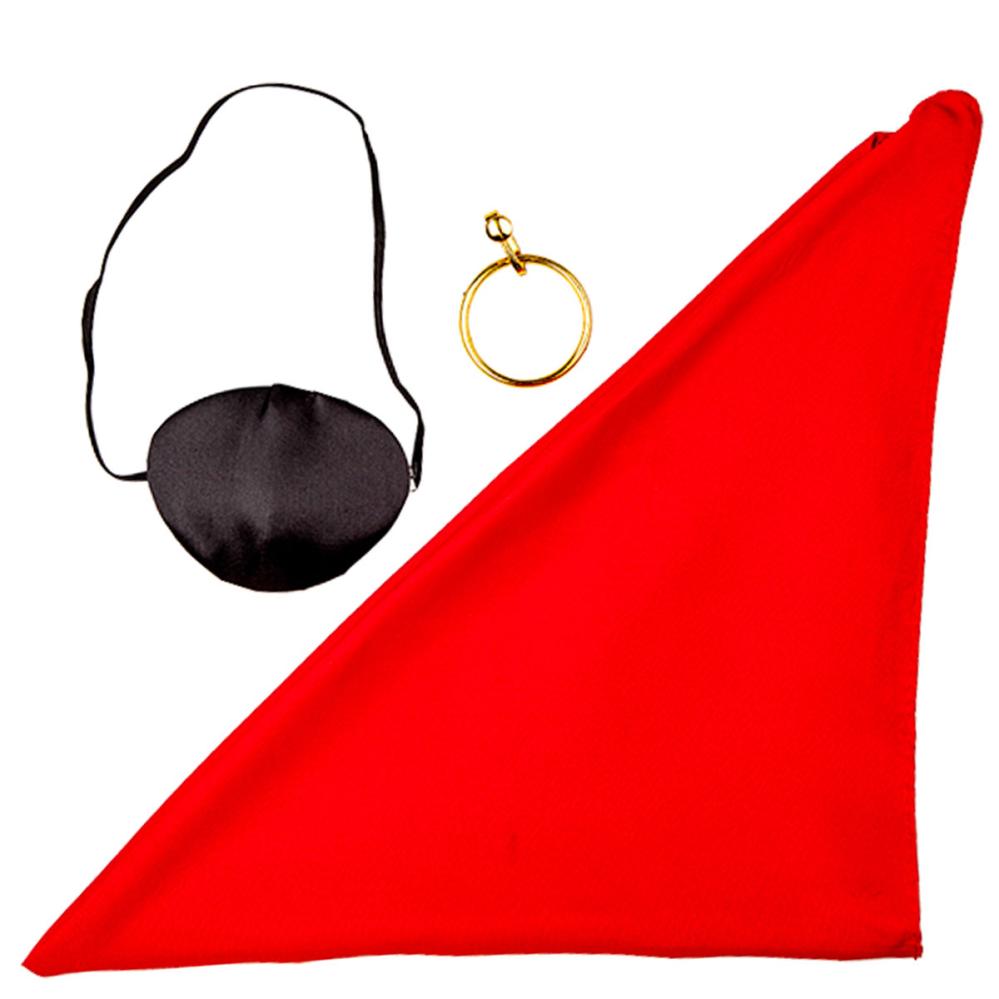 Piratsett 3-pakning inneholder en rød bandana, en gullfarget rund ørering samt en svart øyelapp.