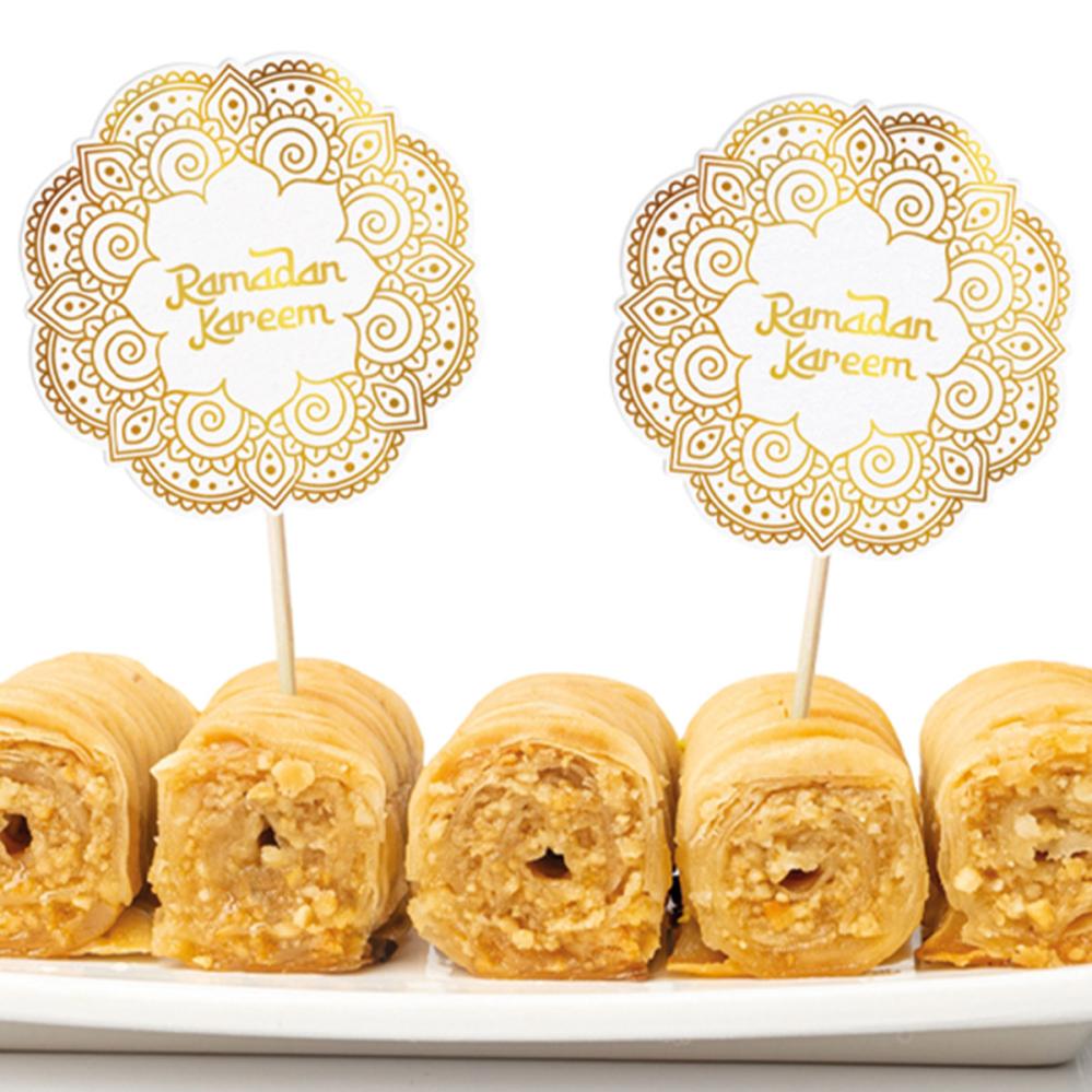 Ramadan Kareem Partypicks 12-pakning består av tolv trepinner med runde, hvite papirdekorasjoner som er pyntet med et vakkert gullfarget mønster og teksten ”Ramadan Kareem”. Partypinnene har trykk på begge sider.