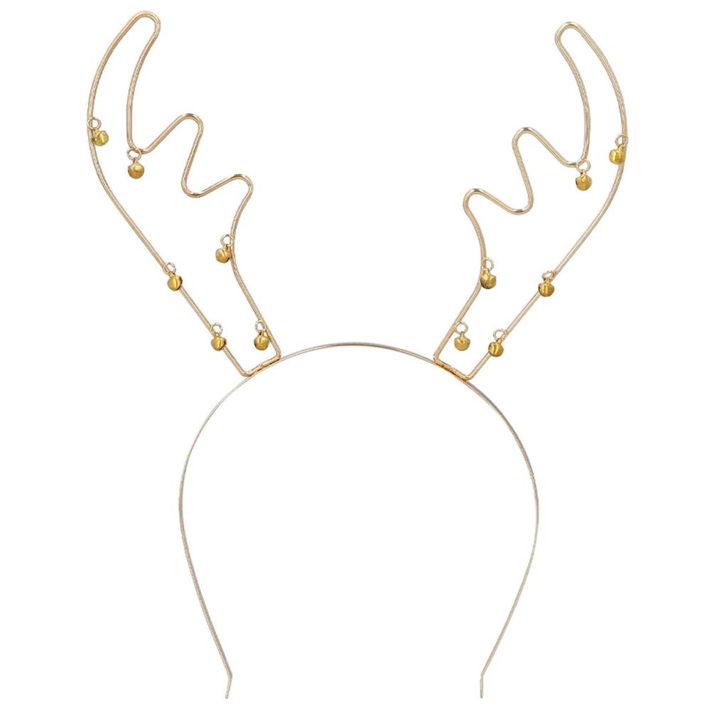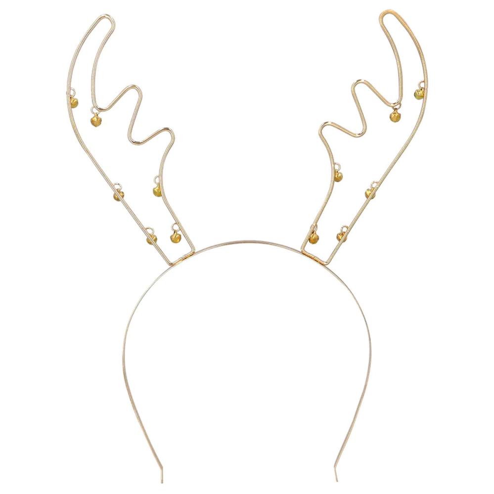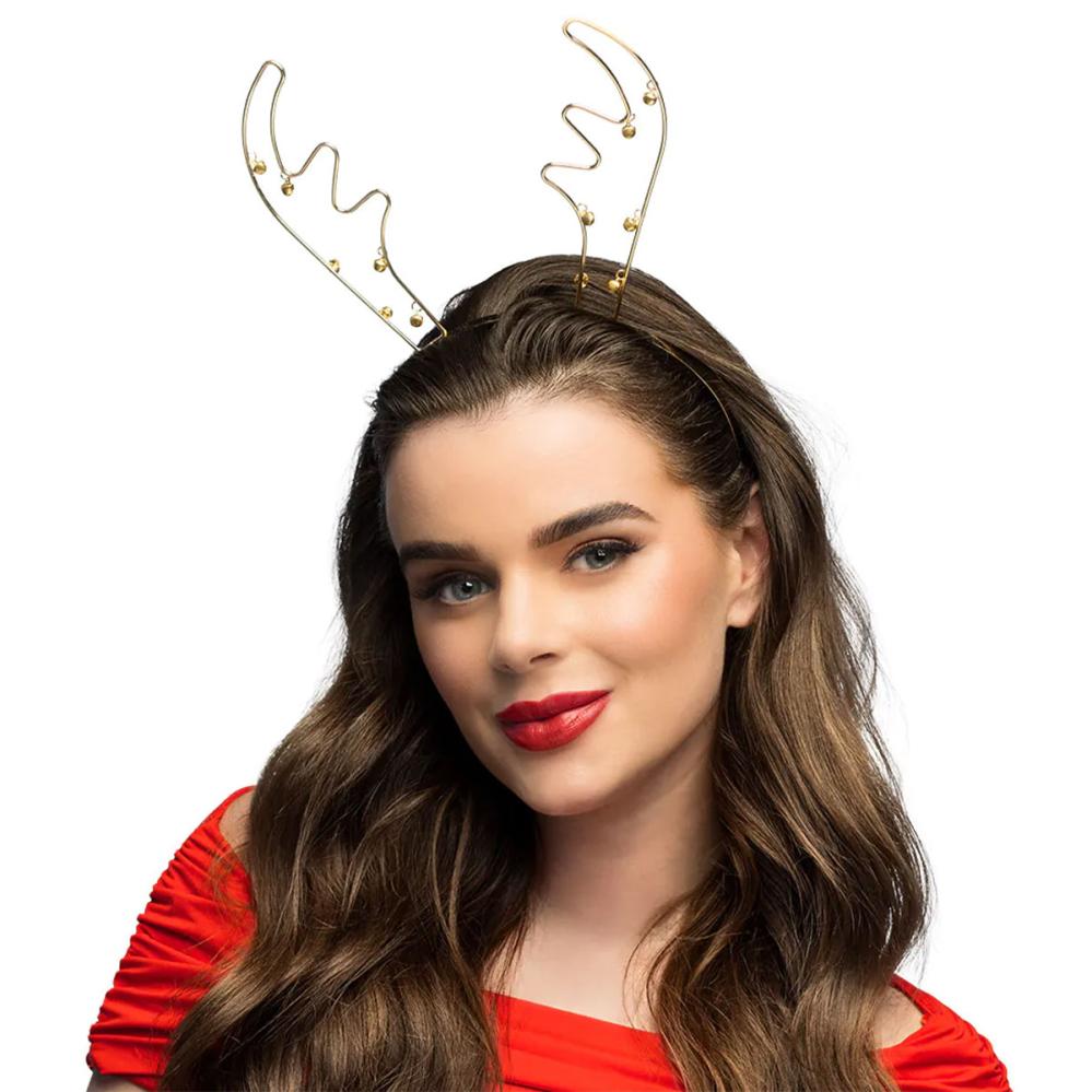 Reinsdyrhorn Julehårbøyle med Bjeller Gull omfatter en gullfarget hårbøyle med reinsdyrhorn og bjeller.
