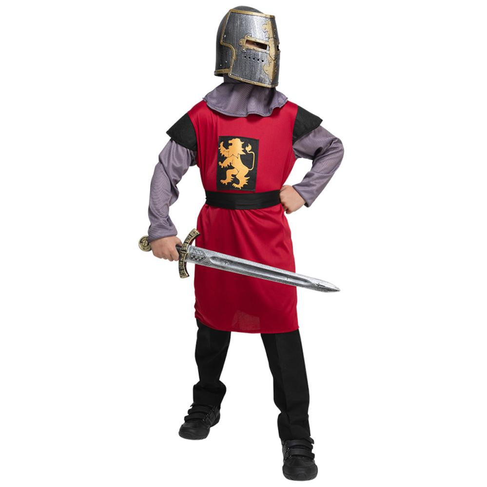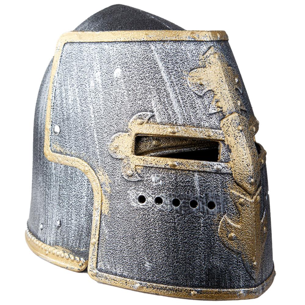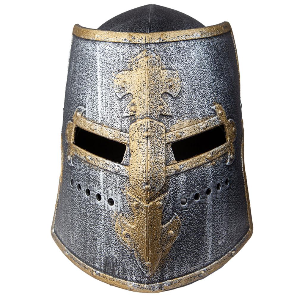 Ridderhjelm med Visir omfatter en virkelighetstro og sølvfarget ridderhjelm som kommer i klassisk utførelse med gyldne detaljer. Hjelmen har et visir som er opp- og nedfellbart samt har hull for øyne og nese.