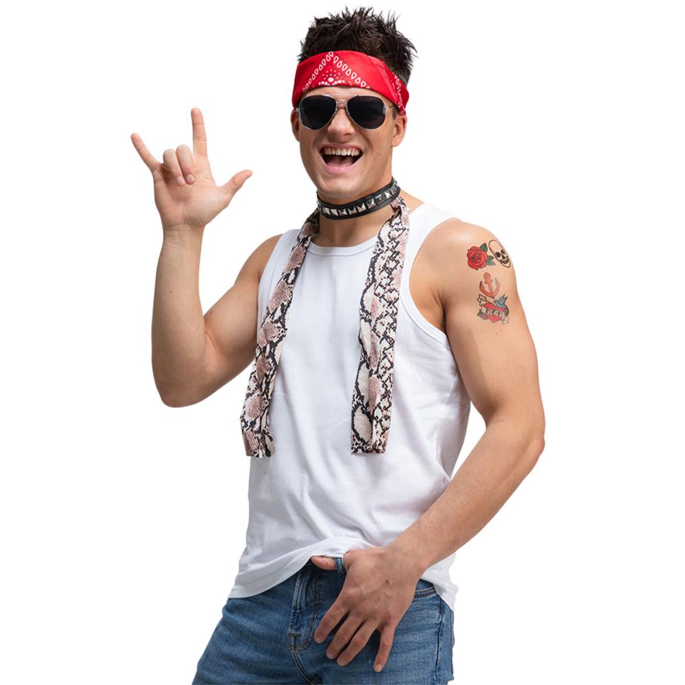 Rock Kostymtilbehør 3-pakning inneholder en rød bandana med svarte og hvite detaljer, et par pilotbriller med sølvfargede rammer og svarte linser samt en svart choker dekorert med sølvfargede nagler og fastsydd skjerf med slangeskinnsmønster.