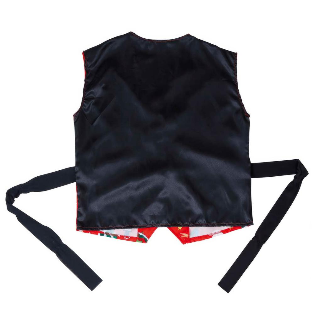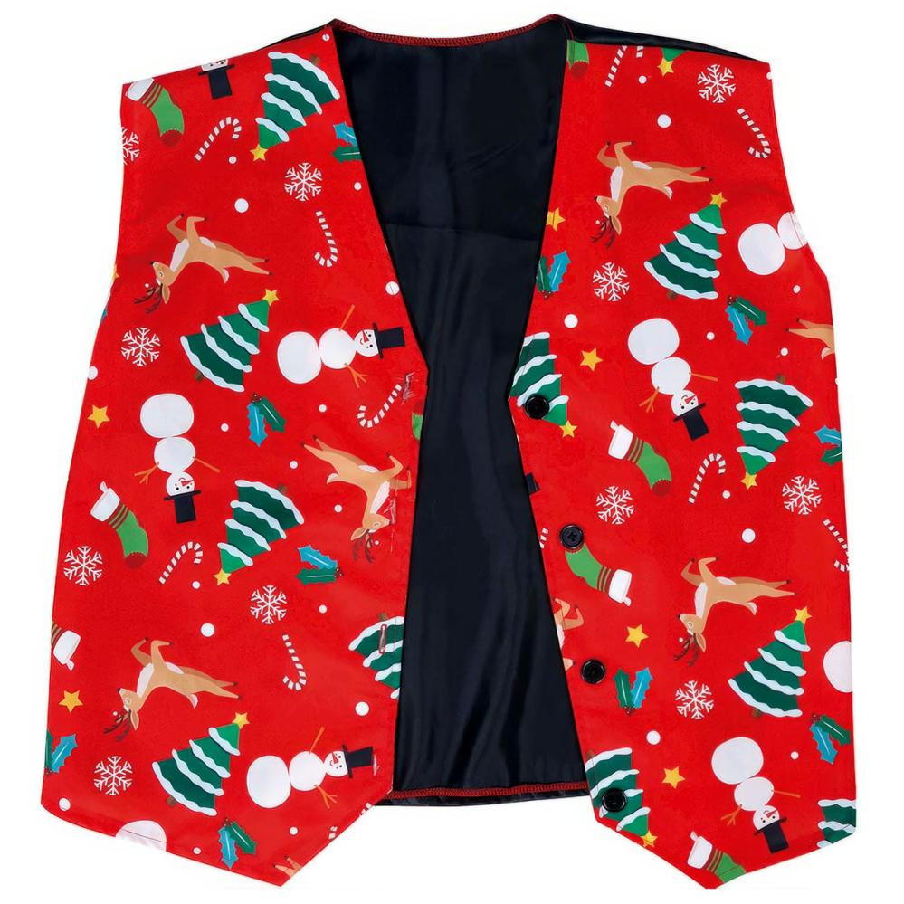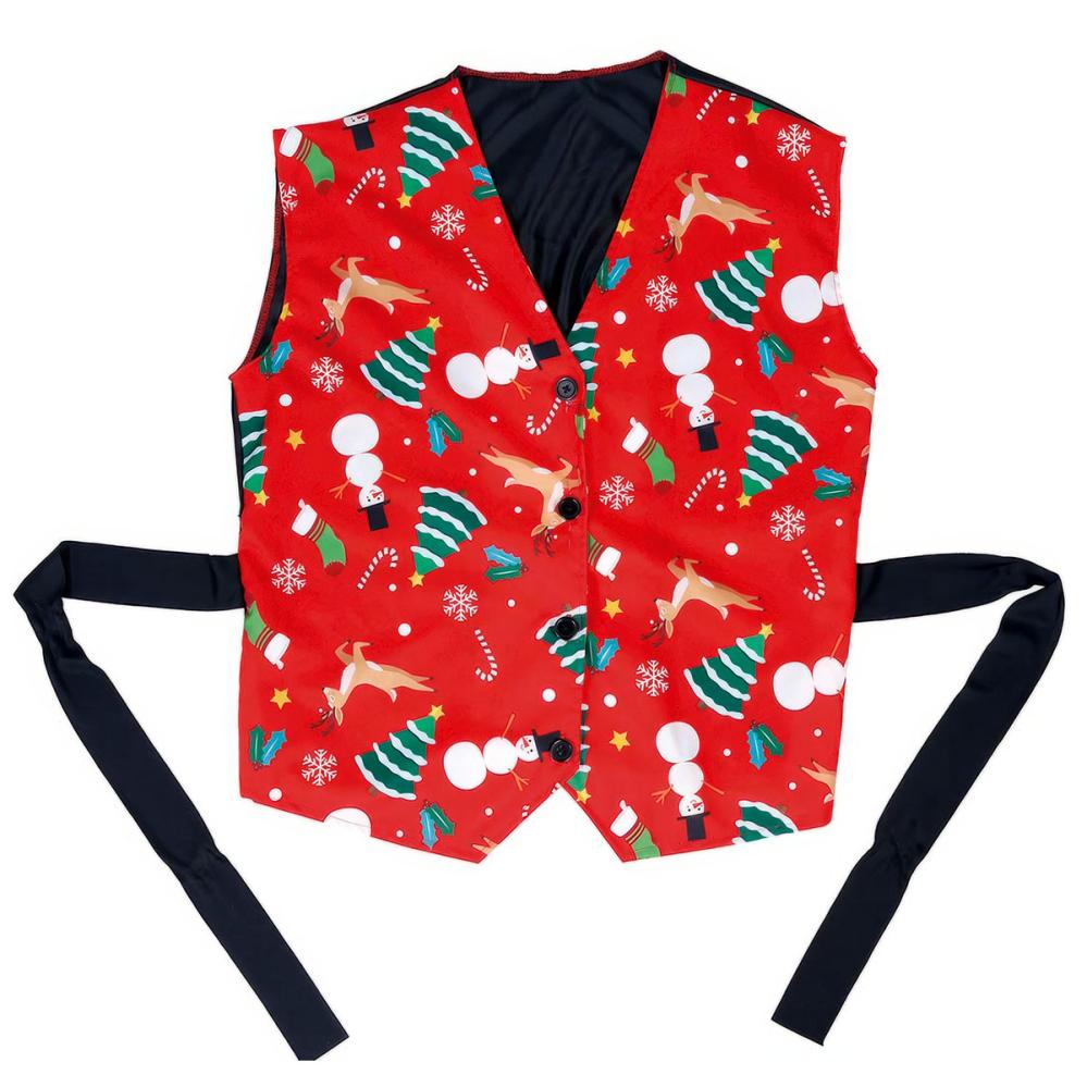 Rød Julevest omfatter en rød vest med julemotiv, svarte knapper foran og et justerbart svart ryggbånd for bedre passform. Vesten prydes av juletrær, julereinsdyr, snømenn, julestrømper, polkastokker med mer. Observer at kun vesten inngår, sløyfen følger ikke med.