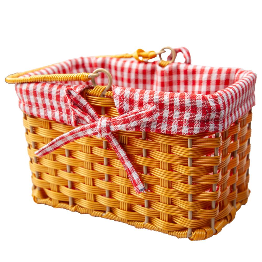 Rødhettes Kurv er en sjarmerende flettet piknikkurv i gul nyanse, pyntet med en rød og hvit rutete duk og et praktisk håndtak, inspirert av eventyret om Rødhette.