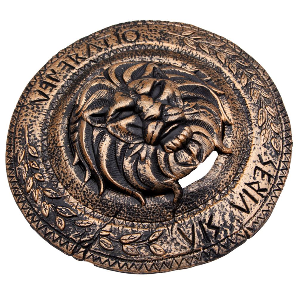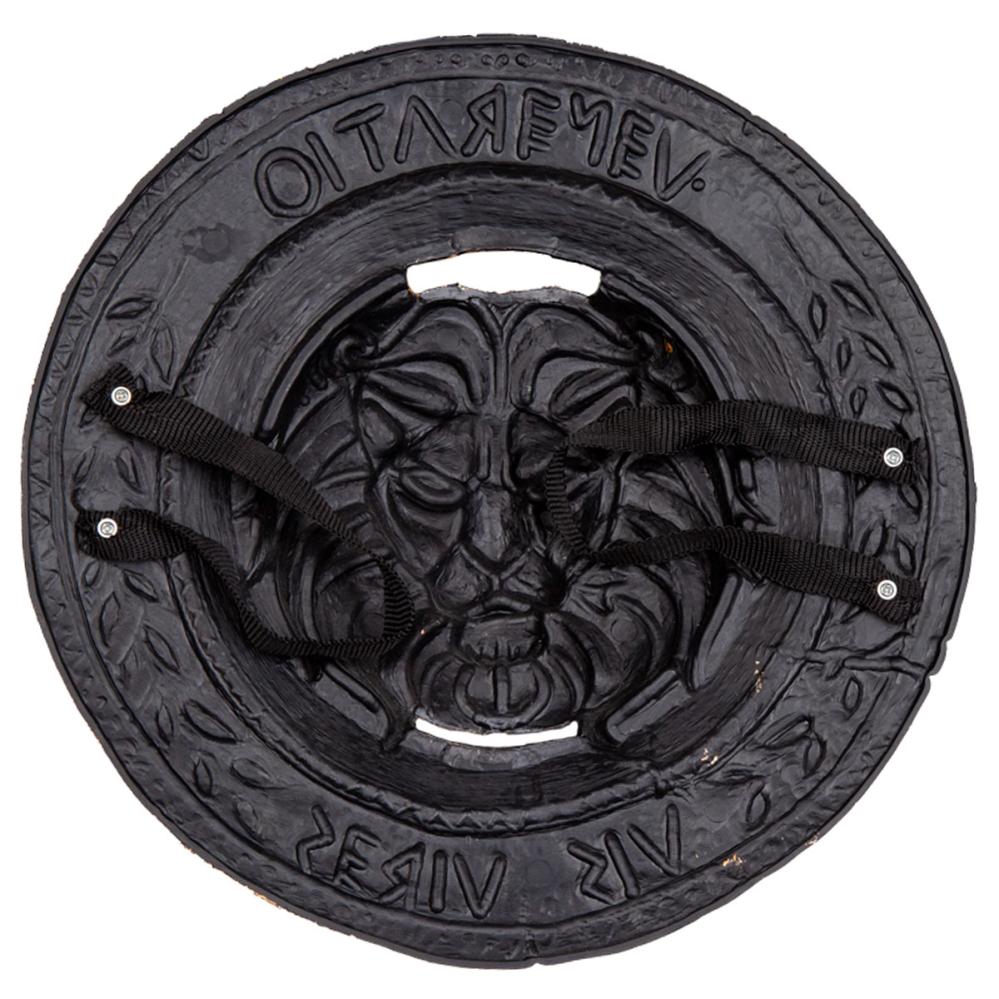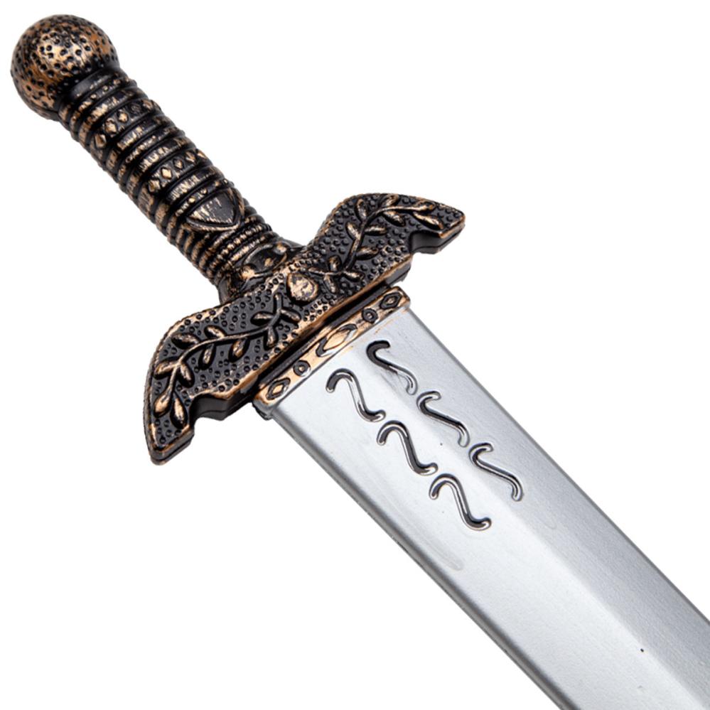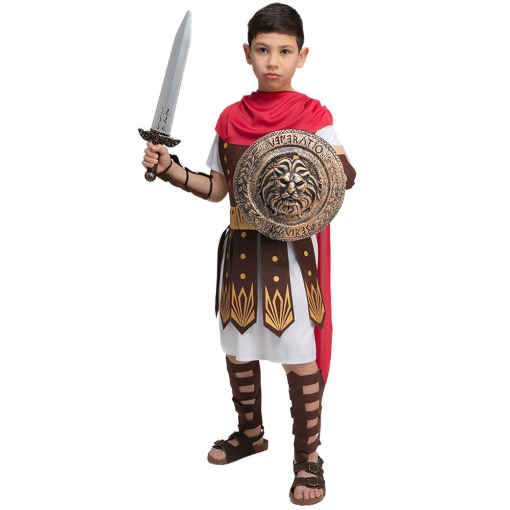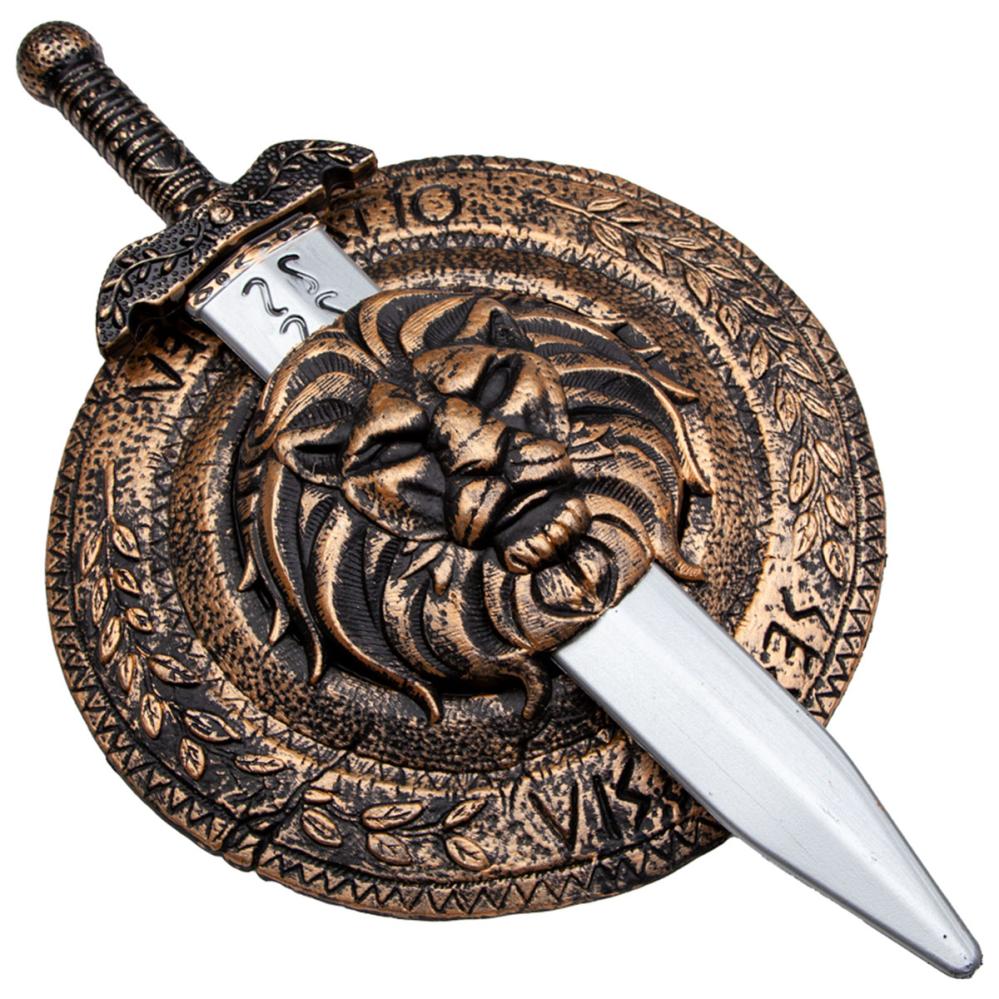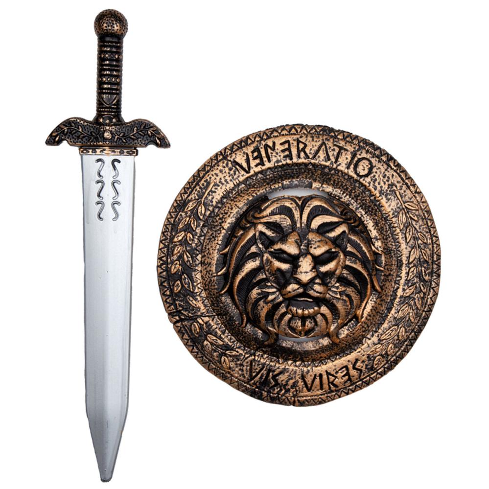 Romersk Sverd og Skjold Barn består av et romersk skjold- og sverdsett for barn. Skjoldet er rundt, har en antikk bronsefarge, motiv av et løveemblem i midten, har et hull for oppbevaring av sverdet samt to hemper på baksiden for å holde skjoldet i. Sverdet har et bronsefarget håndtak med detaljerte motiver og et grått blad.