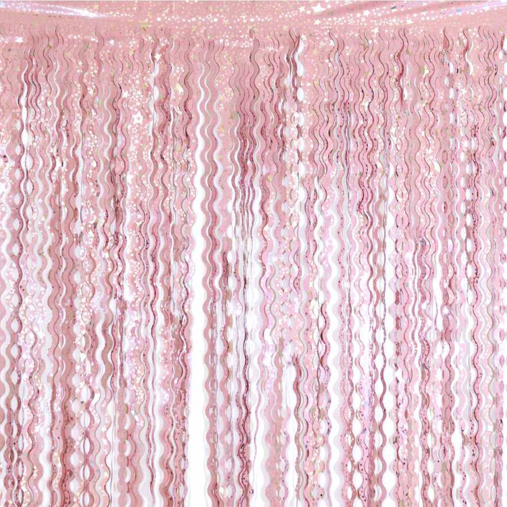 Rosa Dørforheng Swirls med Stjerner omfatter et dørforheng med lange rosa swirls dekorert med sølvfargede stjerner.
