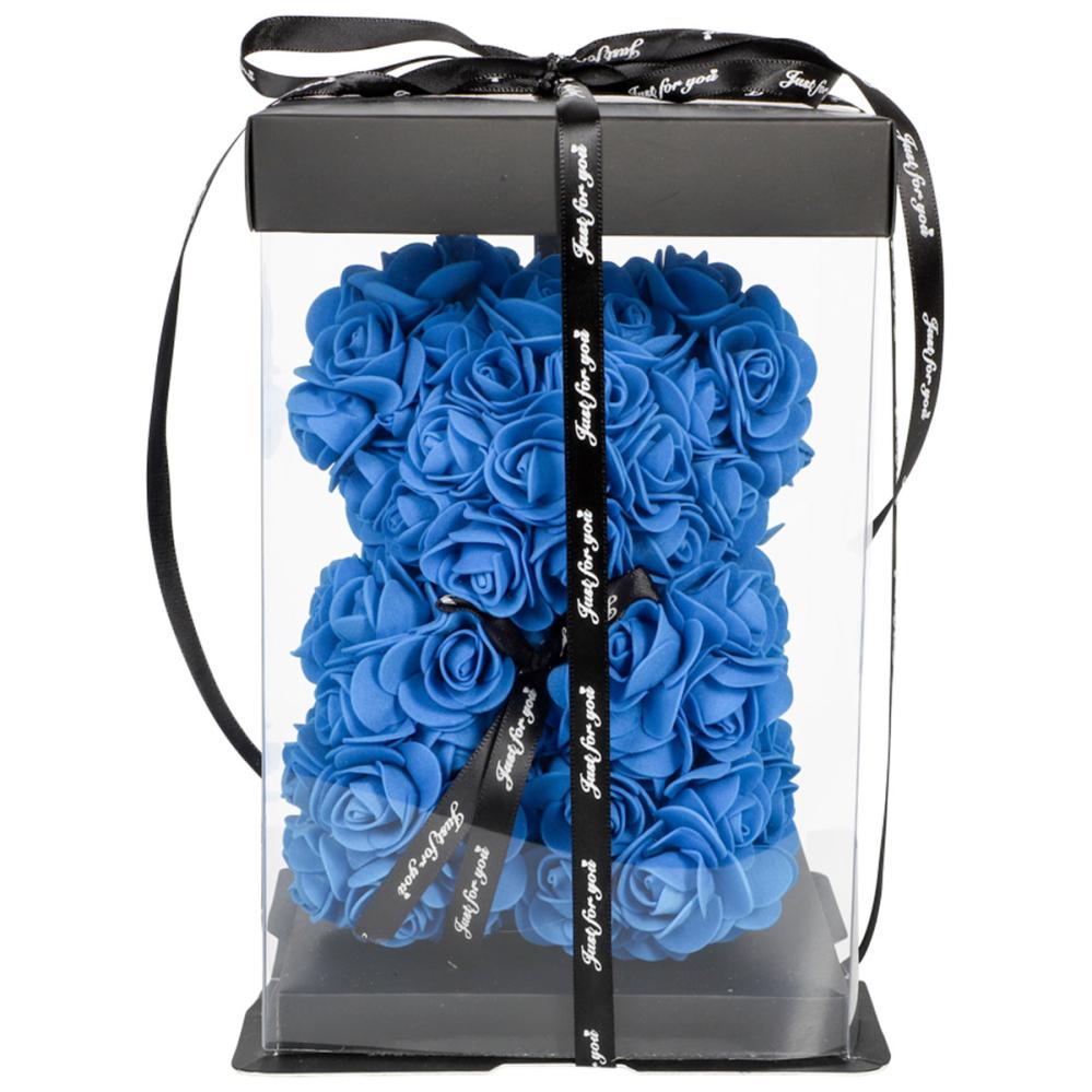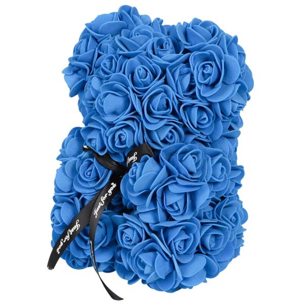 Rosebamse Blå 21 cm er en bamse av myke blå plastroser med en kjerne av isopor. Den har et svart silkebånd rundt halsen, formet som en sløyfe med teksten ”Just for you”, samt et matchende silkebånd rundt den gjennomsiktige gaveforpakningen som den leveres i.
