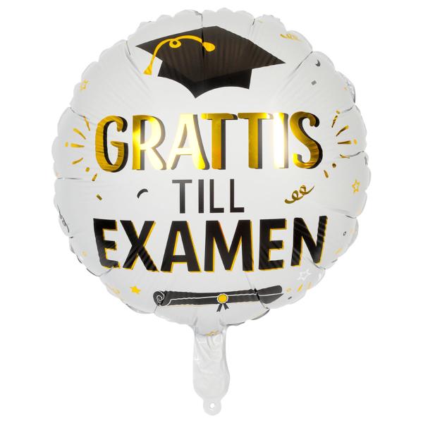 Rund Folieballong Grattis Till Examen 46 cm er en hvit rund folieballong med teksten ”GRATTIS TILL EXAMEN” i svart og gull, en svart eksamenshatt og et svart diplom.