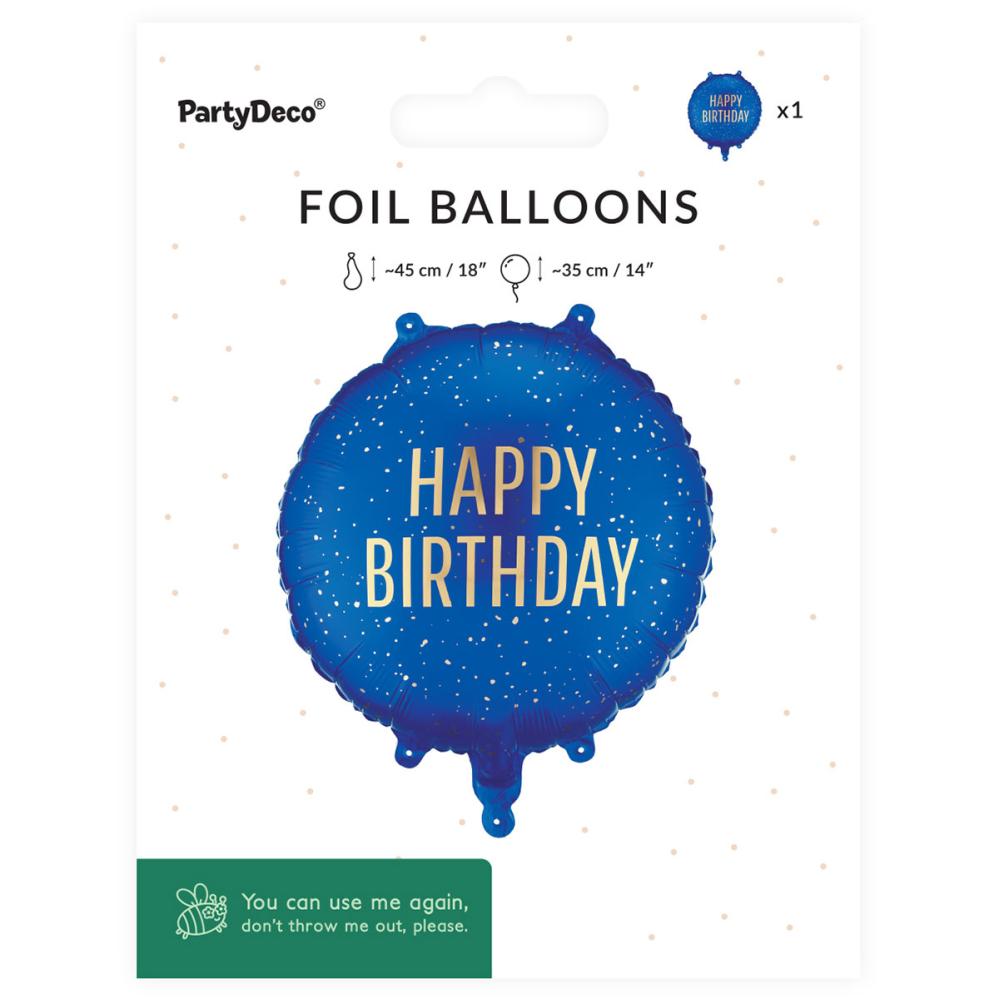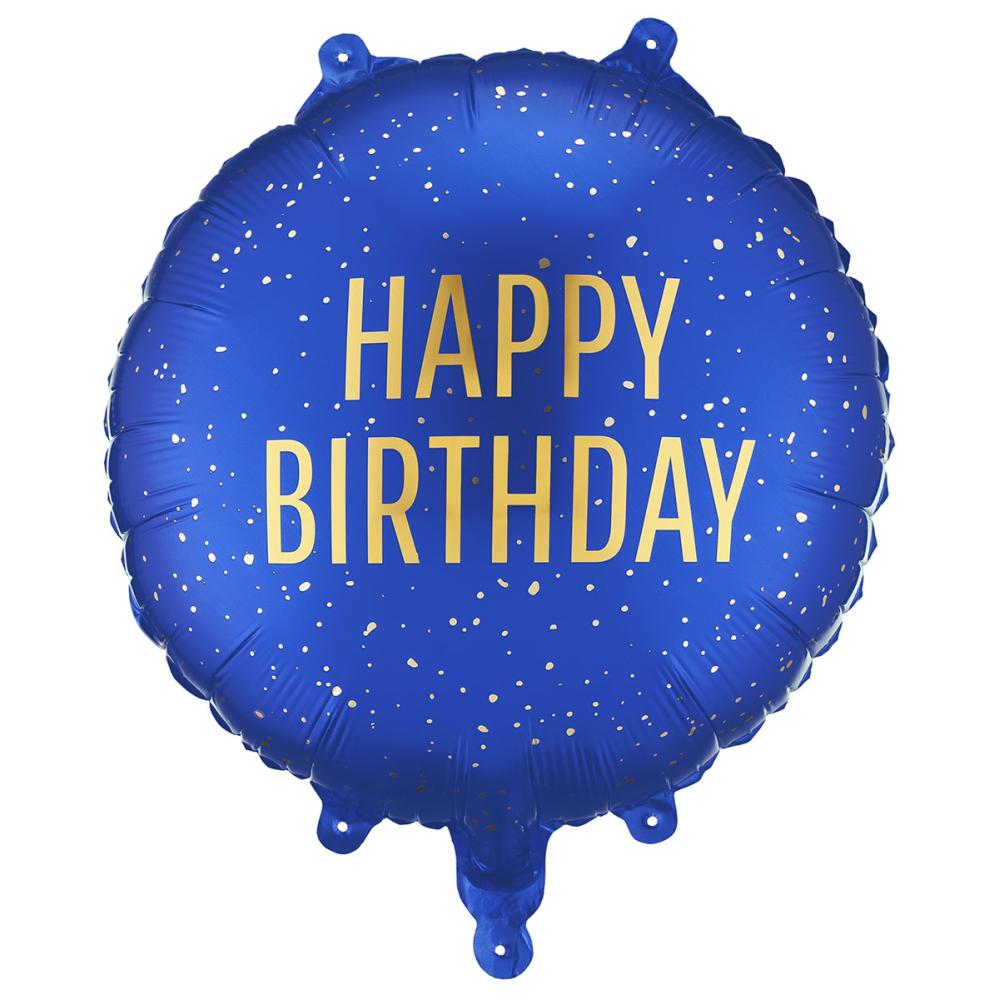 Rund Folieballong Happy Birthday Marineblå 35 cm er en rund, marineblå folieballong med teksten 'HAPPY BIRTHDAY' og dekorative prikker i gullfarge. Kan fylles med luft eller helium og leveres med et sugerør for oppblåsing.
