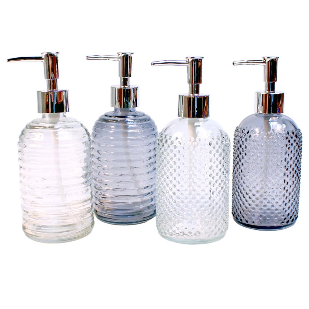 Såpe- og Oppvaskmiddeldispenser 500 ml består av en glassflaske med sølvfarget dispenserpumpe i plast. Flasken finnes i to mønstre, et prikkete og et stripete, samt i to ulike fargevarianter.