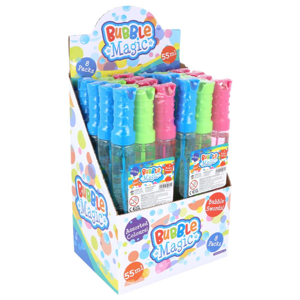 Såpeboblestaver 3-pakning omfatter tre såpeboblebeholdere med håndtak som er fylt med såpeboblevæske for å lage store såpebobler. Beholderne har form som et sverd og kommer i fargene blå, grønn og rosa (en av hver farge).