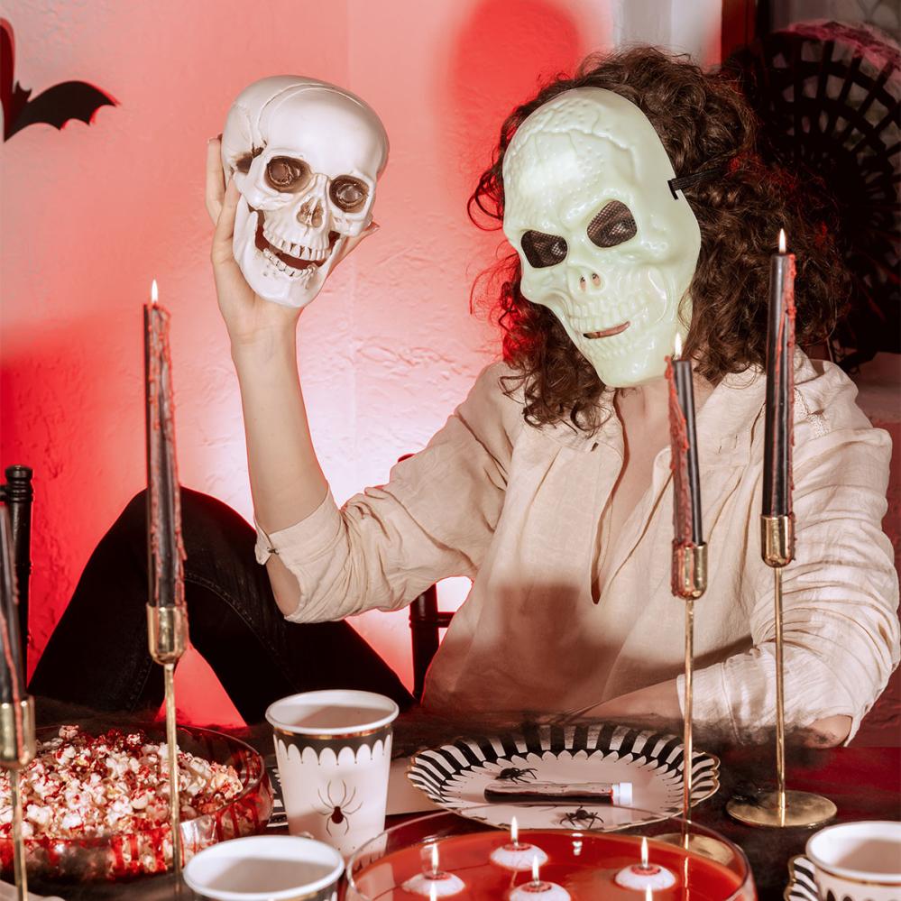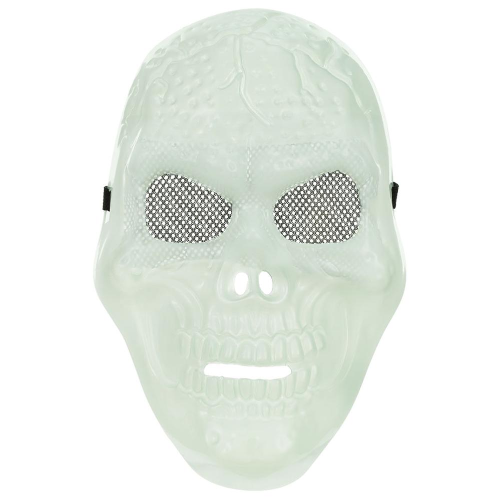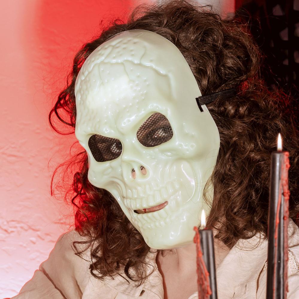 Kle deg ut med en skikkelig skummel følelse når du vil bruke en selvlysende maske til halloween eller kostymefest, der hodeskallen har en uhyggelig effekt i mørket. En hodeskallemaske gir festen en ekstra spesiell stemning.