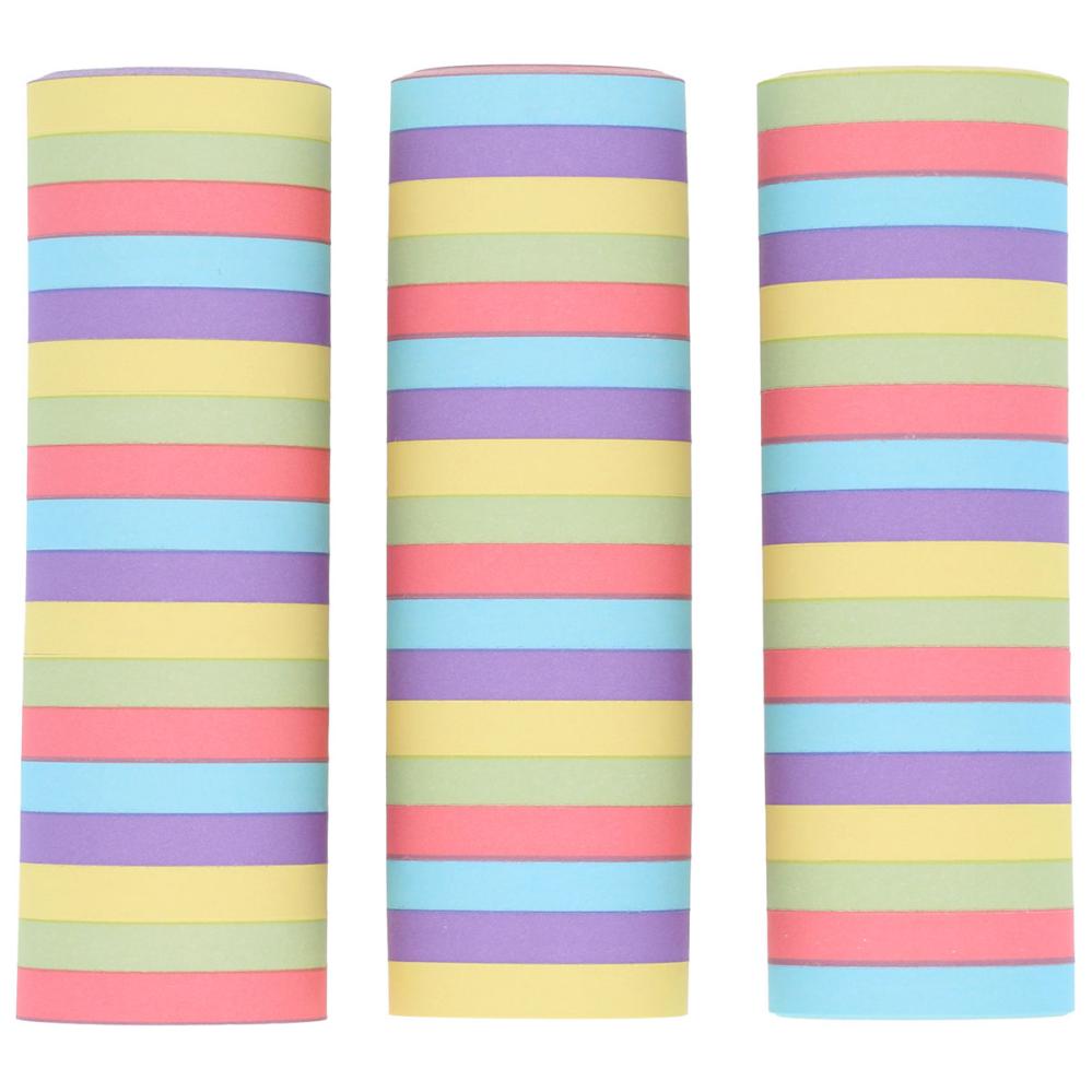 Serpentiner Blandede Farger Pastell 3-pakning omfatter tre ruller med pastellfargede serpentiner i fargene gul, lilla, blå, rosa og grønn.
