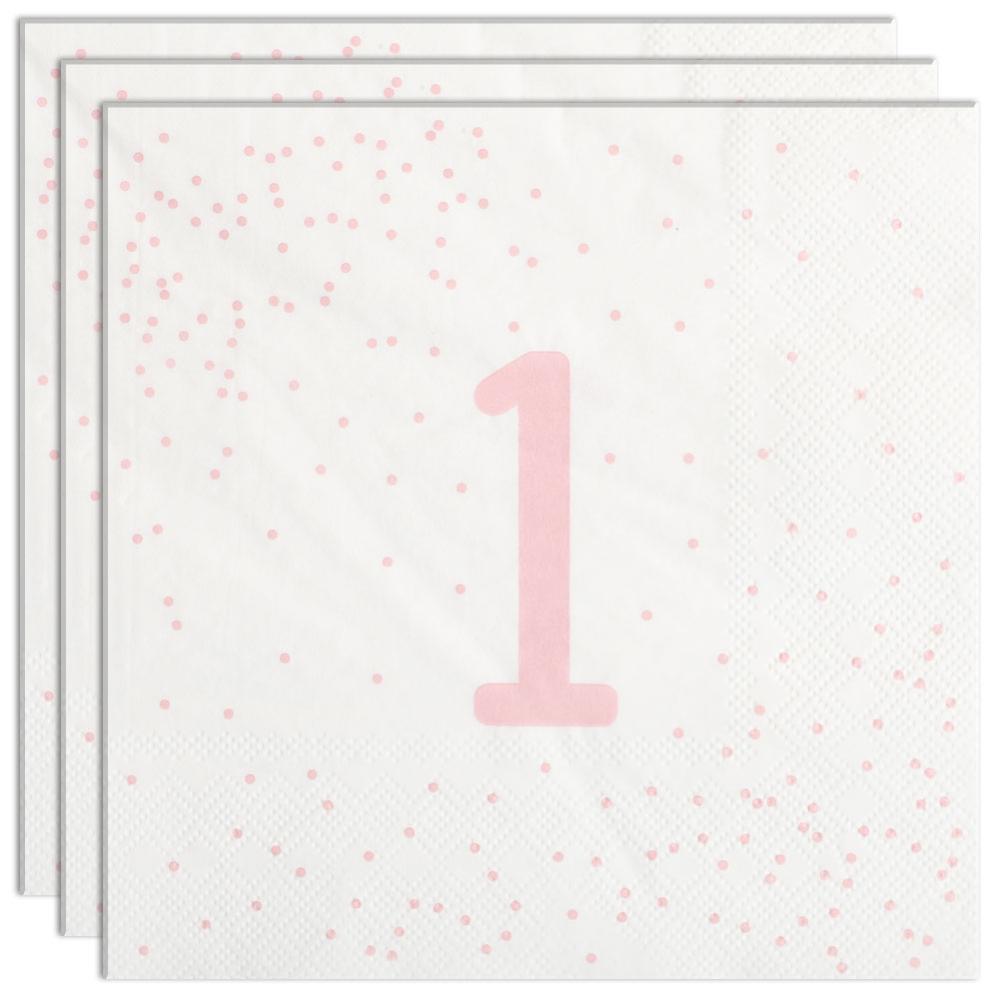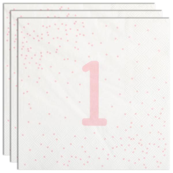 Servietter 1 år Lysrosa med Prikker 16-pakning består av seksten hvite engangsservietter i tre lag med lysrosa motiv av tallet ”1” samt små prikker.
