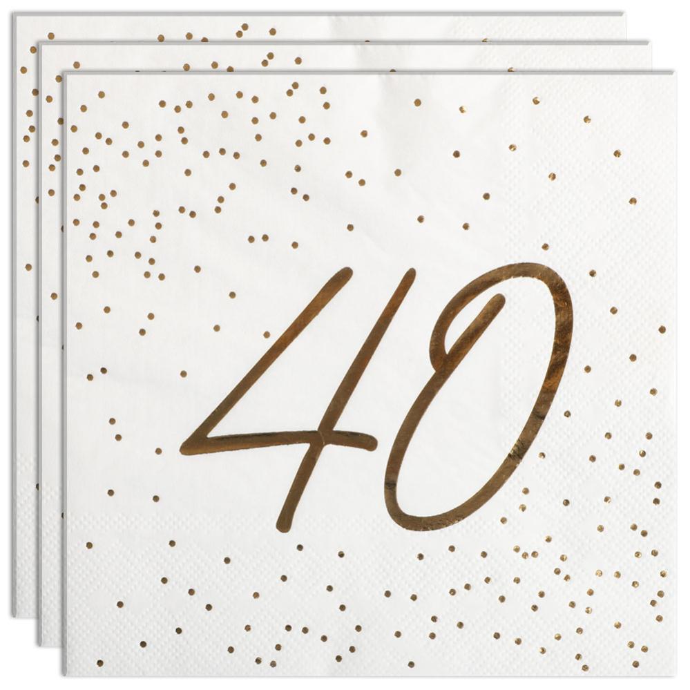 Servietter 40 år Gull med Prikker 16-pakning består av seksten hvite engangsservietter i tre lag med tallet ”40” og små prikker trykt i skinnende gull på én side, mens de øvrige sidene er helt hvite.