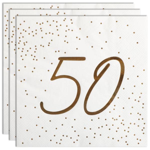 Servietter 50 år Gull med Prikker 16-pakning består av seksten hvite engangsservietter i tre lag med tallet ”50” og små prikker trykket i skinnende gull på én side, mens de øvrige sidene er helt hvite.