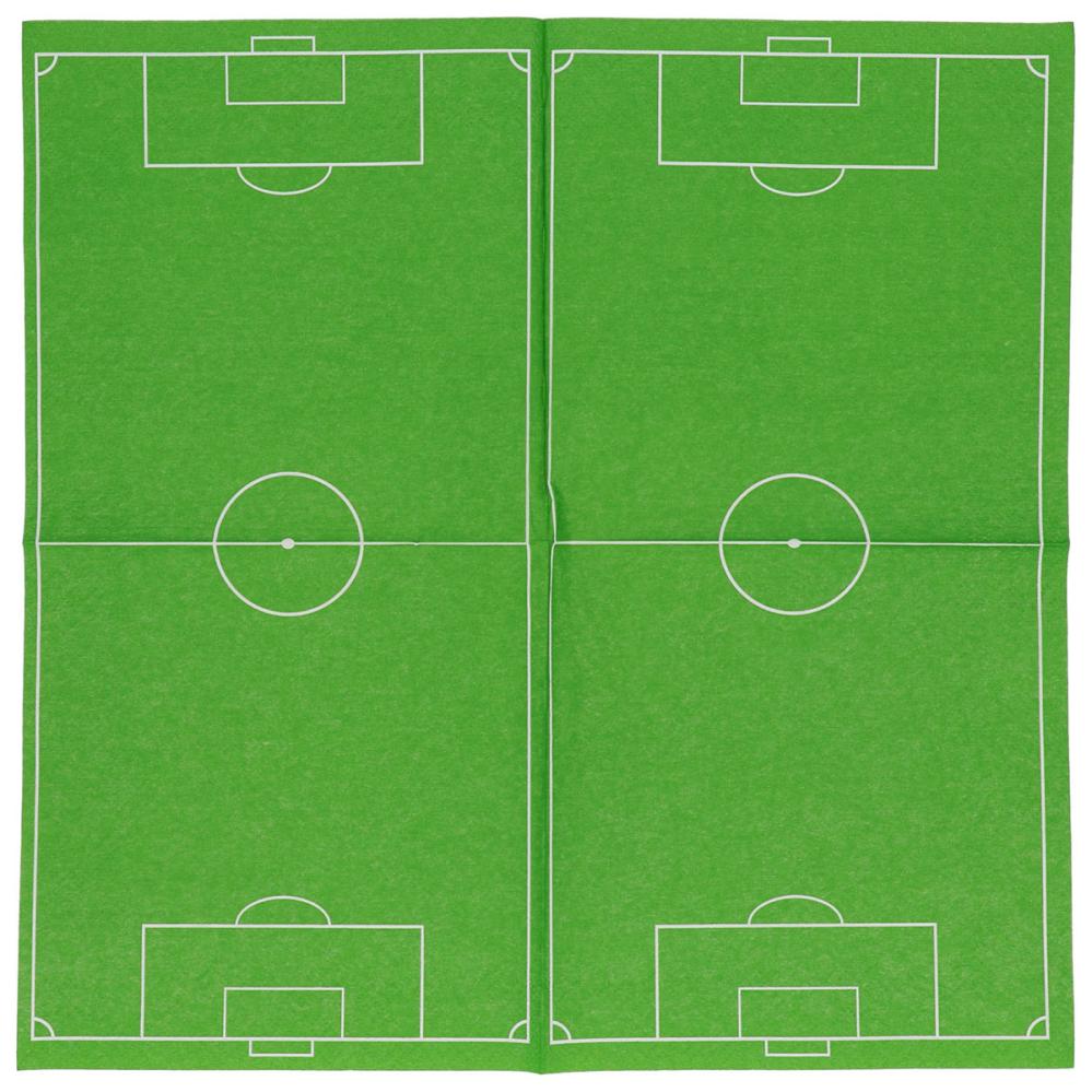 Servietter Fotballbane 20-pakning består av tjue lysegrønne papirsservietter med hvitt motiv av en klassisk fotballbane.