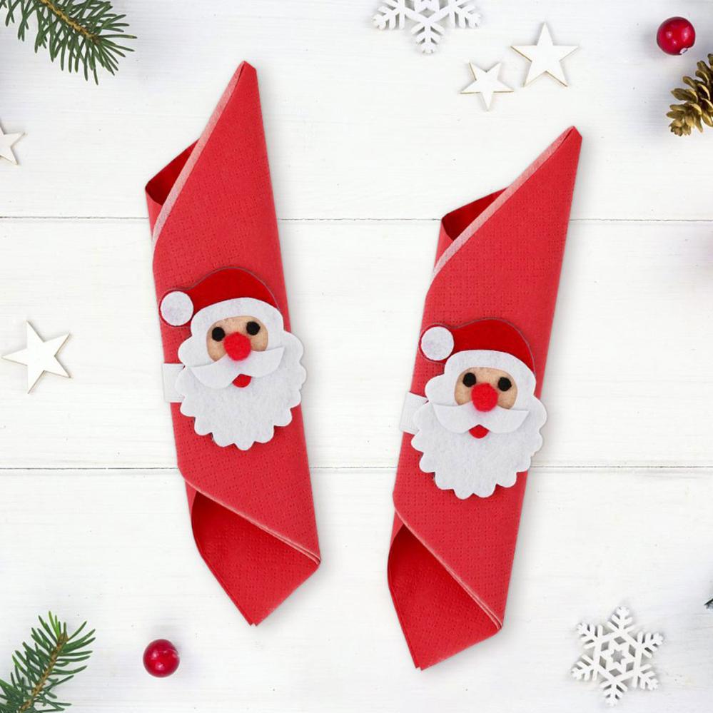 Serviettringer Julenisse 2-pakning inneholder to serviettringer formet som julenissens hode og utstyrt med hvite strikkbånd.