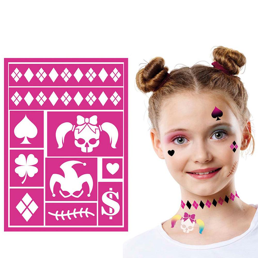 Skap et unikt uttrykk med disse sjablongene for en uforglemmelig Halloween inspirert av Harley Quinn. Motivene inkluderer spar, hjerter og hennes ikoniske hodeskalle, perfekte for å dekorere eller komplettere sminken og kostymen din med et lekent preg.
