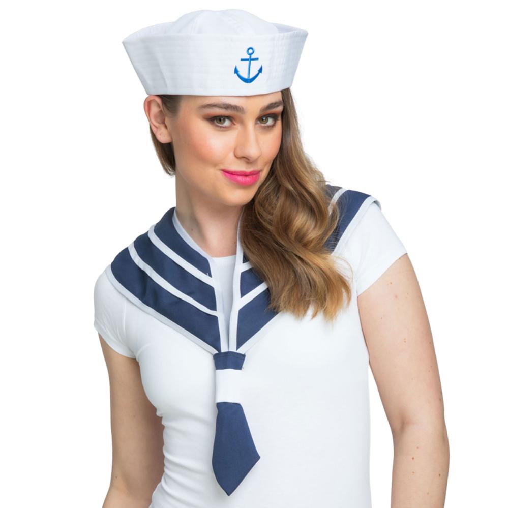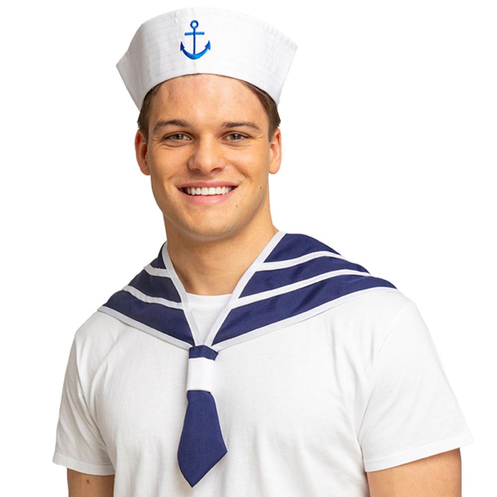 Sjømann Maskeradesett 2-pakning omfatter en hvit sjømannshatt med et blått brodert anker samt et blått og hvitt stripet sjømannsskjerf.