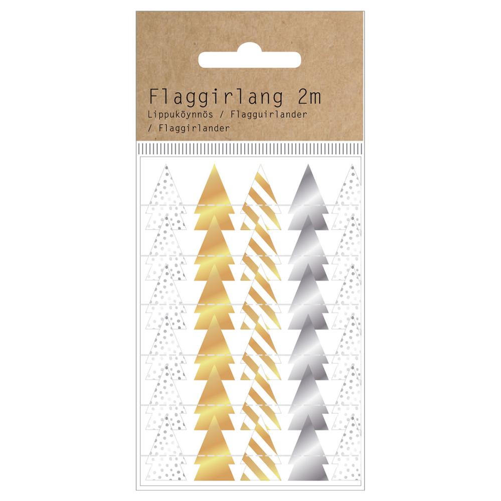 Skimrende Gavebånd Juletrær 2 m omfatter et gavebånd i form av en girlander med små juletrær i skimrende gull og sølv på en hvit tråd.