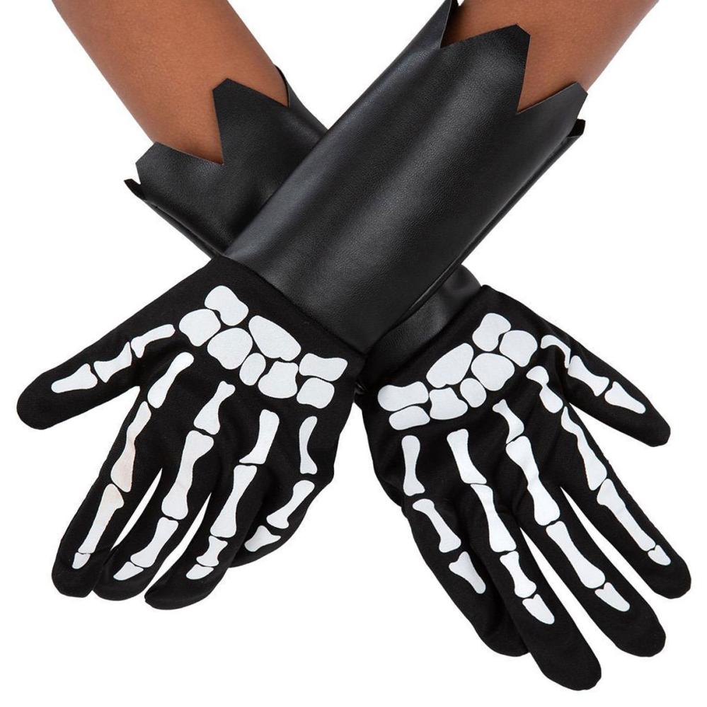 Skjelett Barnehansker omfatter et par svarte hansker med skjelettmotiv som har en lang mansjett laget i imitert skinn.