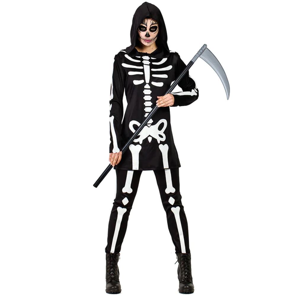 Skjelettdrakt med Hette omfatter en lang genser med hette og lange ermer samt et par bukser i svart og hvitt.