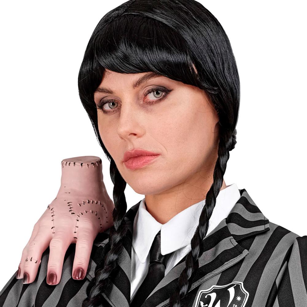 Skummel Hånd med Sting omfatter en dekorasjon i form av en hånd i blekrosa med svarte sting og rødbrune negler.
