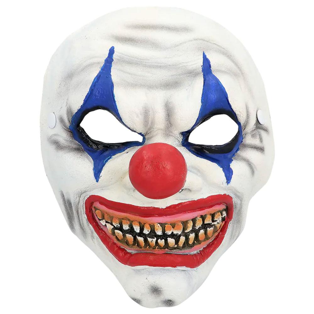 Skummel Smilende Klovnemaske omfatter en hvit klovnemaske med et skummelt smil, røde lepper, rød nese og blå farge rundt øynene. Masken har hull for øyne, nese og munn og holdes på plass med et svart elastisk bånd.