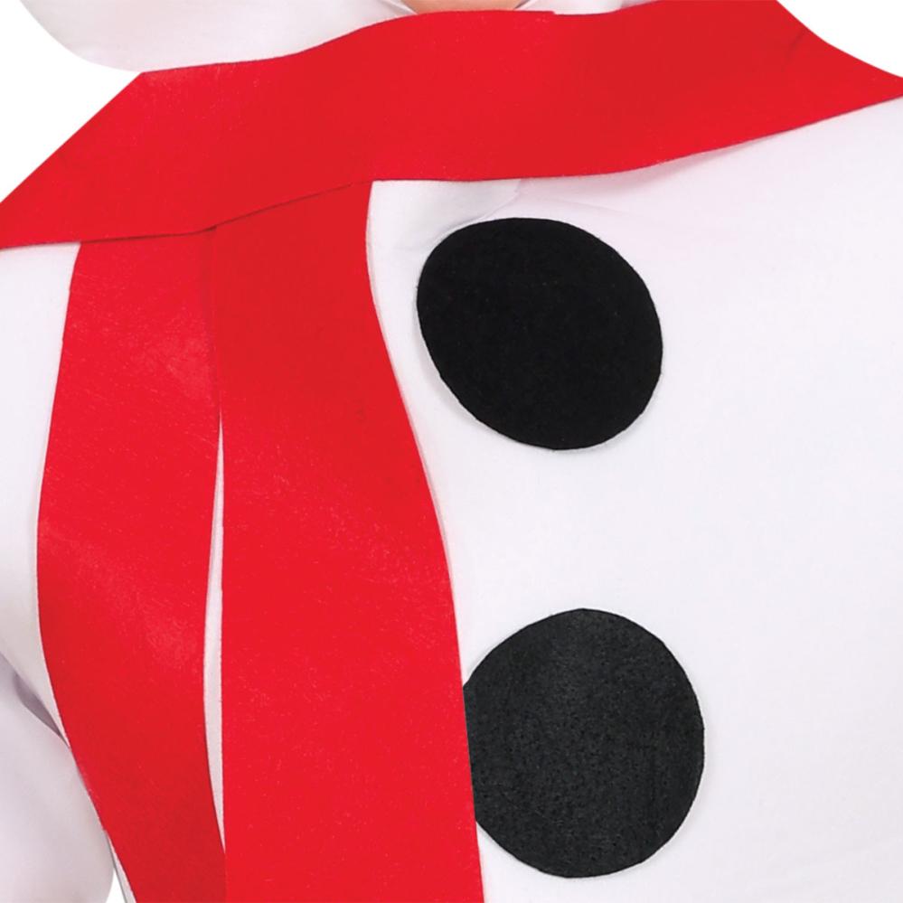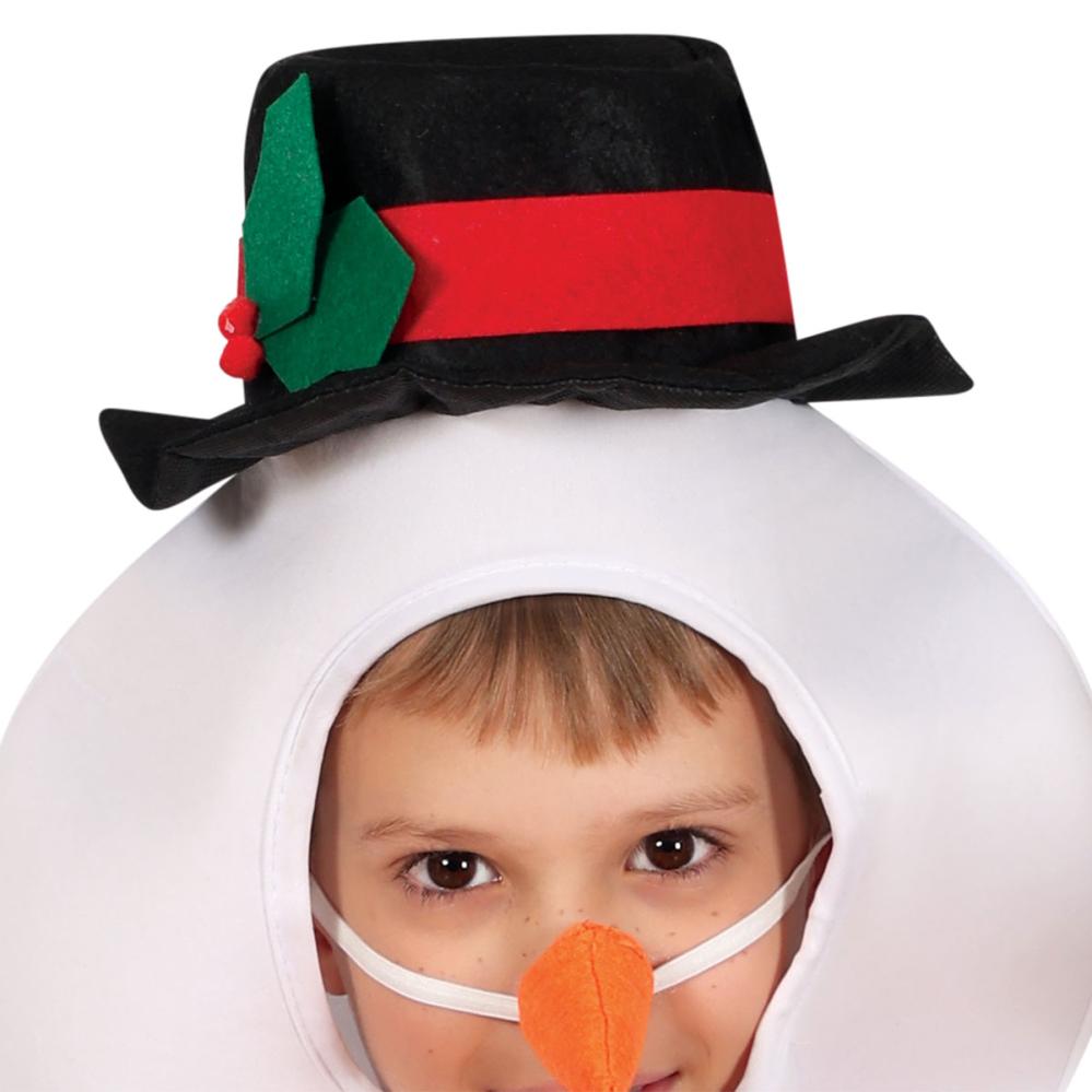 Snømann Barn Kostyme omfatter en hvit, vattert snømanndrakt med fastsydd svart hatt, rødt skjerf og tre svarte knapper på magen. En liten gulrotnese med et hvitt elastisk bånd og borrelåsfeste følger også med.